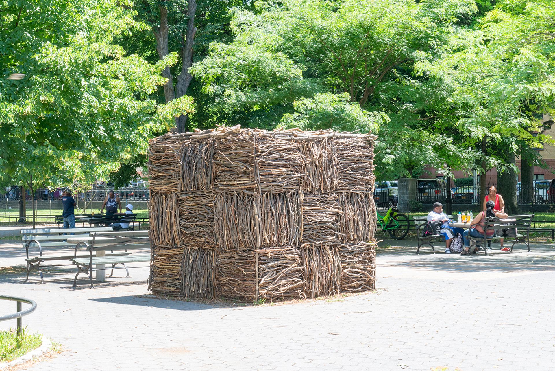 Site-specific sculptures constructed out of branches pruned from trees in other New York City Parks have been installed around Marcus Garvey Park by the Harlem-based artist Maren Hassinger. The works were a collaborative effort, she says, with 75 volunteers from the community contributing their physical labour as well as their ideas. This result of this (re)cycling of material and landscape are eight massive, abstract pieces that respond to, resist and reimagine the horticulture and architecture that surrounds them. The project is part of inHarlem, the Studio Museum’s off-site programming focusing on community engagement while their new galleries are under construction.