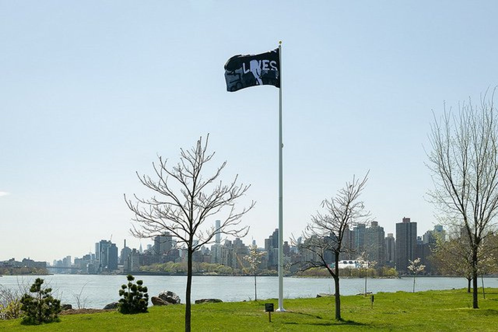 Still flying high since the Frieze New York tent came down, Adam Pendleton’s Black Dada Flag (Black Lives Matter) remains on the southern tip of Randall’s Island. This is the second in a series of the banners, the first of which was commissioned for the Venice Biennial in 2015 following the death of Treyvon Martin, which in part sparked the Black Lives Matters movement. The one waving in the wind today is a larger version and takes on a new significance at its current site—once known as Negro Point.