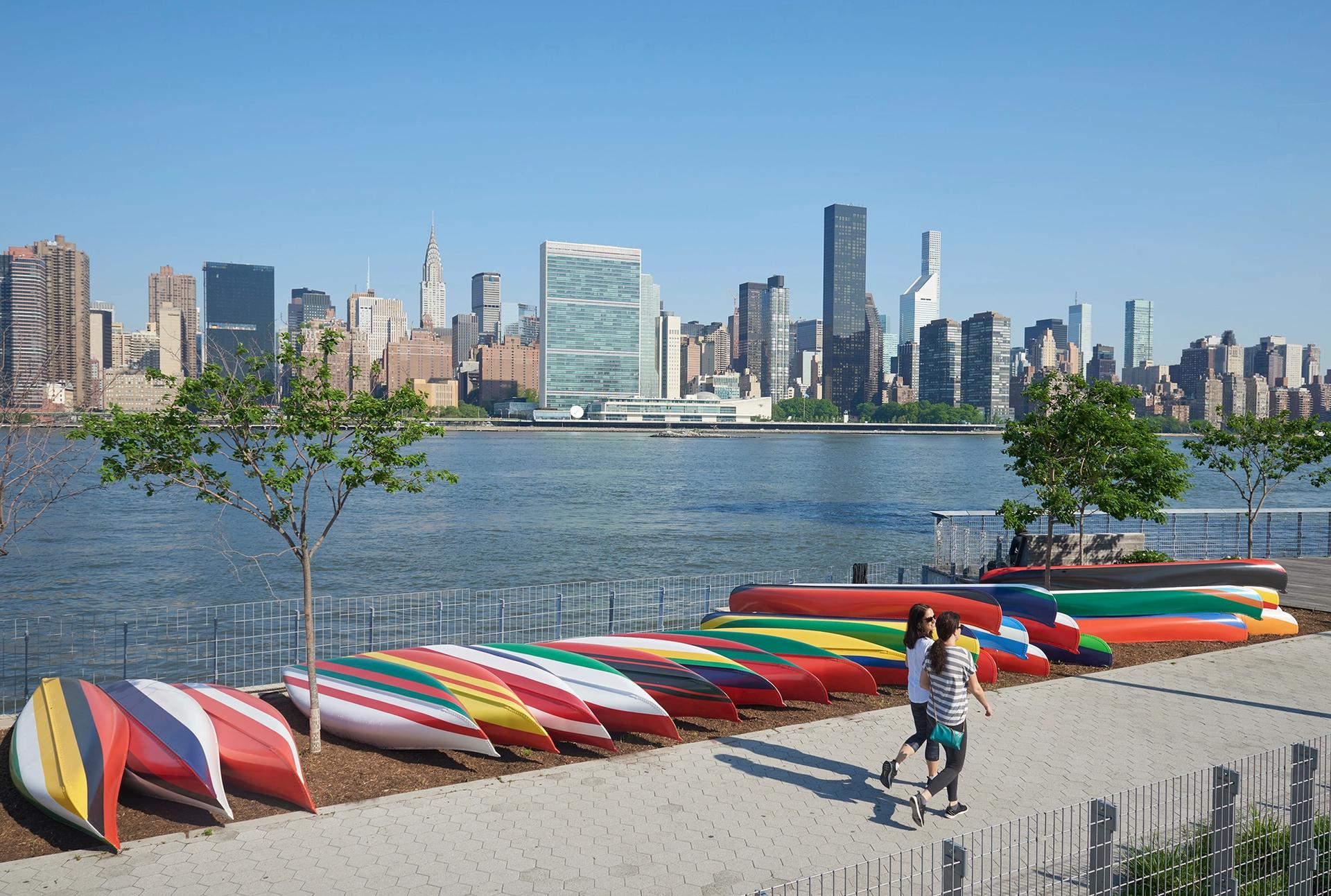 Colourful canoes line the shore of the East River, but these will never grace the water. Instead the aluminium boats in the New York-born artist Xaviera Simmons’ installation borrow their colours from the national flags of the many immigrant communities in Queens, the city’s most diverse borough. The commission takes on a poignant relevance in the light of the Trump administration’s rapidly shifting and increasingly hardline immigration policy.