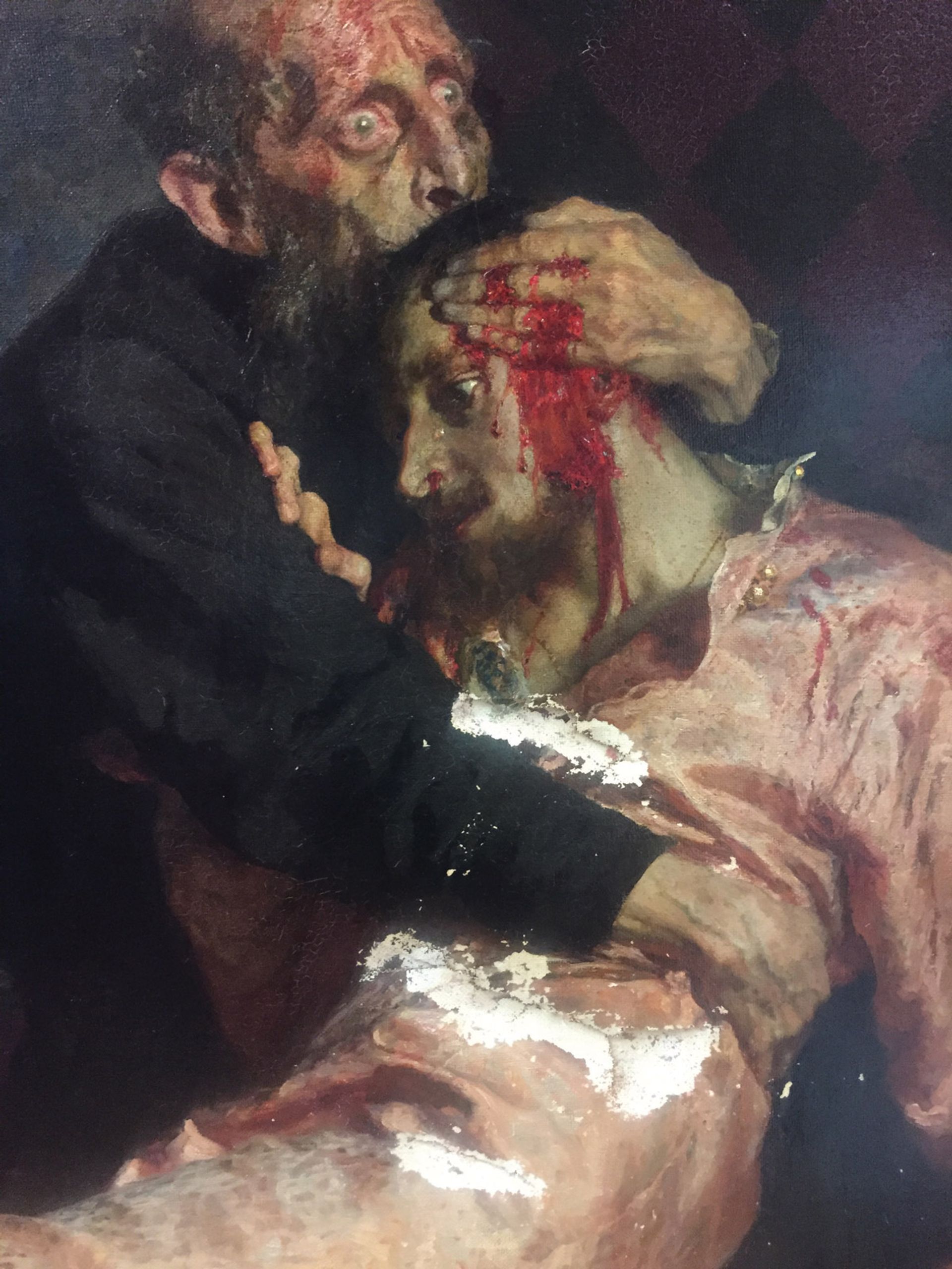 The picture was struck by a security barrier that tore the canvas in three places and damaged the frame. The faces and hands of both Ivan and his son were, amazingly, unscathed. The faces were restored after a previous attack in 1913 by a mentally-ill icon painter. More recently, the work had undergone close examination over several months in preparation for a Repin survey scheduled for 2019.