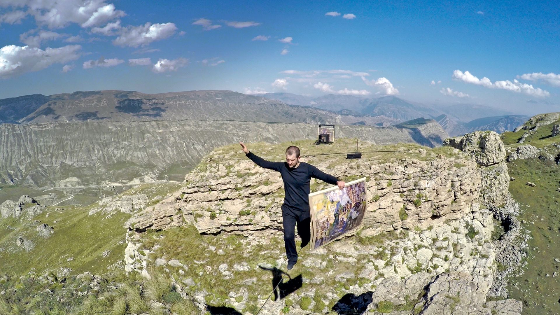 In Tightrope (2015), Rasul Abakarov, a tightrope walker, crossed a canyon in the Caucausus Mountains carrying copies of works from the Dagestani Museum of Fine Art Courtesy Taus Makhacheva