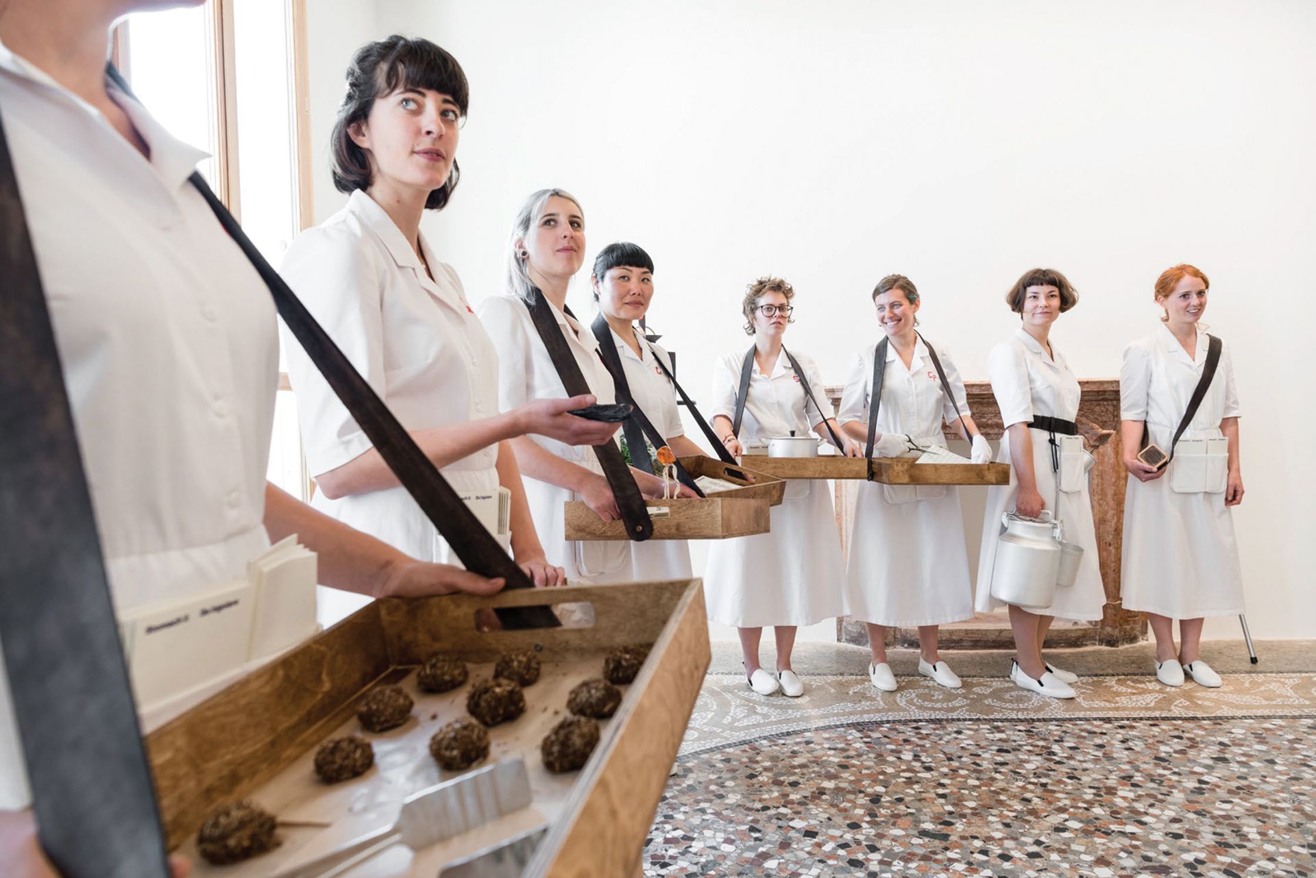 In this work commissioned by V-A-C Foundation for the Venice Biennale in 2017 eight servers offer guests dishes on the theme of “the politics of food”. These consisted of two carrots wrapped in edible paper printed with a poem by Vladimir Mayakovsky; inedible bread made from flour of dried leaves and hay; a dish consisting of a smell developed by a perfumer to imitate the aroma of fatty soup; a loudspeaker on a plate emitting the sound of hungry stomachs; and lollipops in the shape of Lenin’s head. “For me food is the quickest way of accessing different points within the intellectual and the emotional,” Makhacheva says. “All these dishes led to a kind of kinesthetic time travel which evoked the pain of hunger experienced by the millions who suffered starvation and death because of Soviet policies, especially in the 1950s in Ukraine and the Caucasus.”