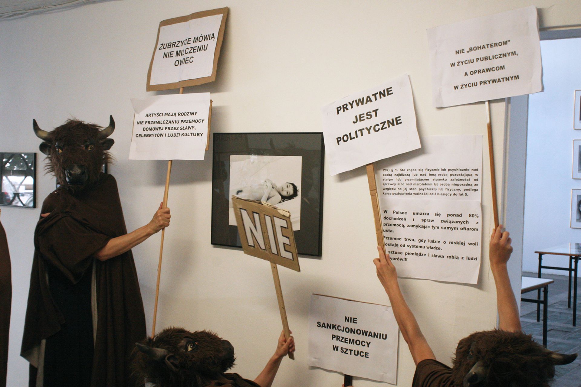 Objecting to the inclusion of Araki in the show, the protesters, a feminist art collective called Zubrzyce—the Polish word for a female bison, a national symbol—carried placards reading: “No to sanctioning violence in art” and scattered printed copies of Kaori’s blog, in which she made the accusations against Araki in April. “Zubrzyce stand in solidarity with Kaori’s letter and stand against violence, wherever it is applied,” according to a statement by the group.