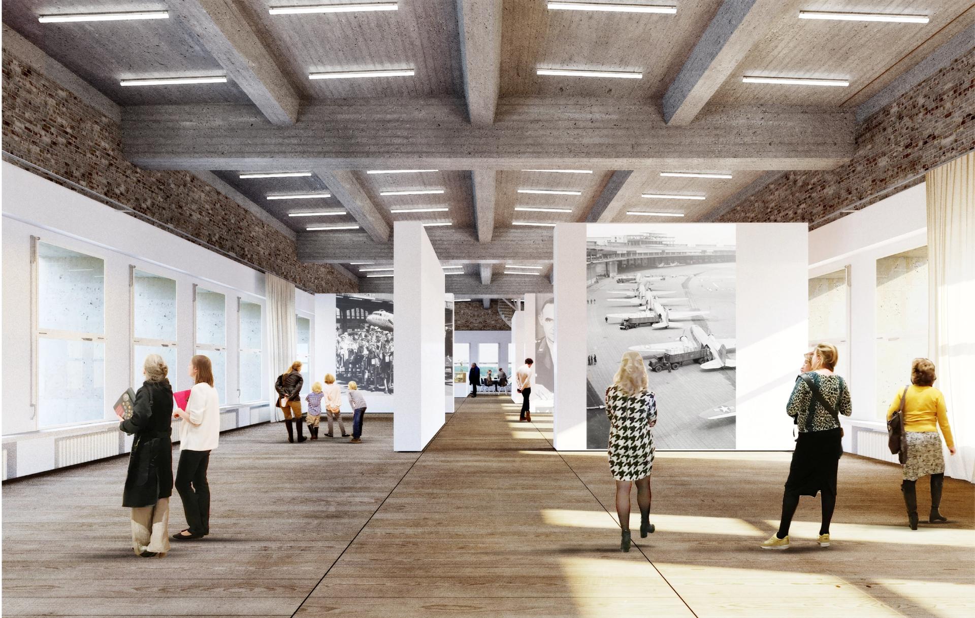 A rendering of the exhibition spaces inside the Tempelhof airport Tempelhof Projekt GmbH, www.thf-berlin.de