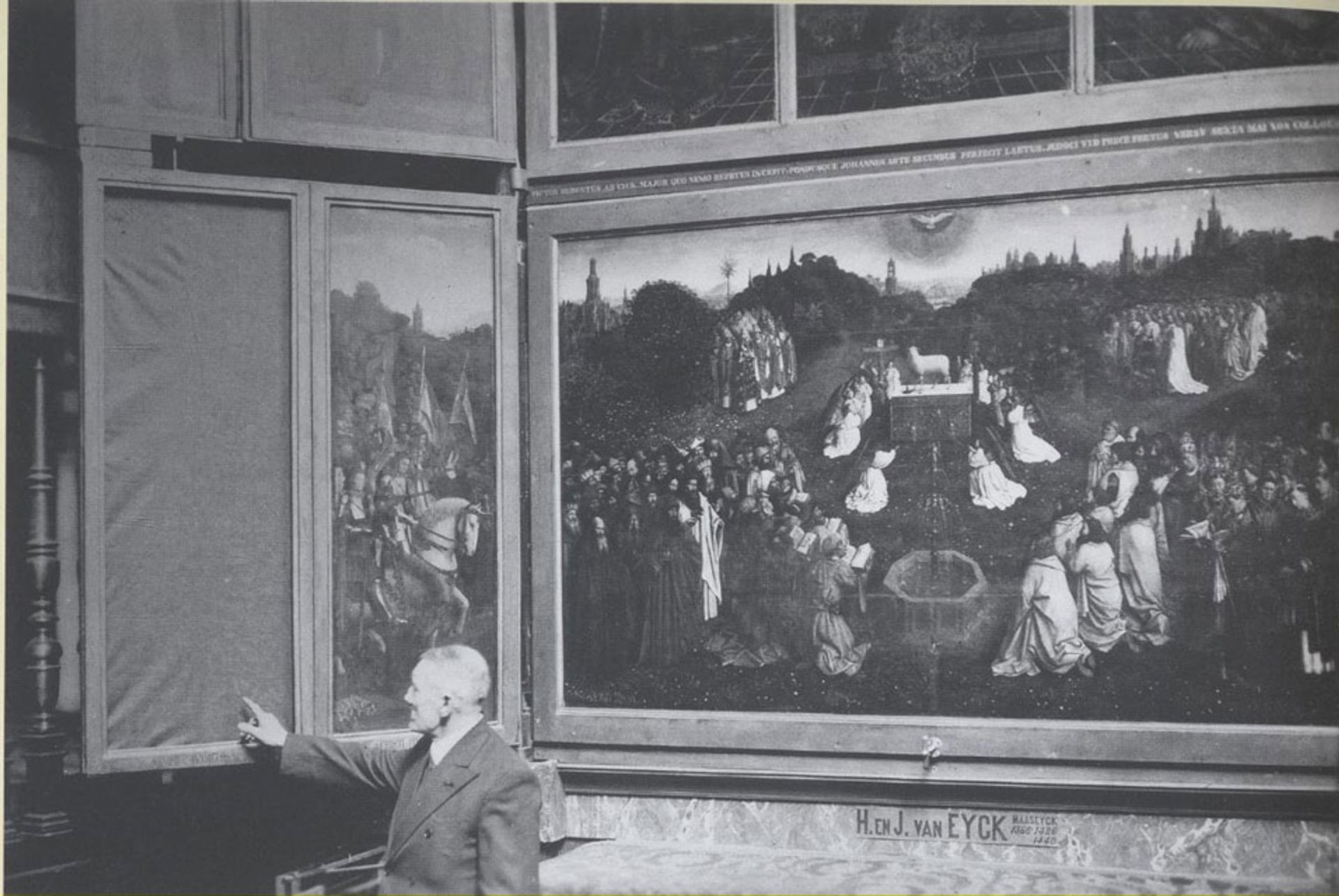 A photo from 1934 taken the morning of the discovery of the theft of the Righteous Judges panel from the altarpiece
