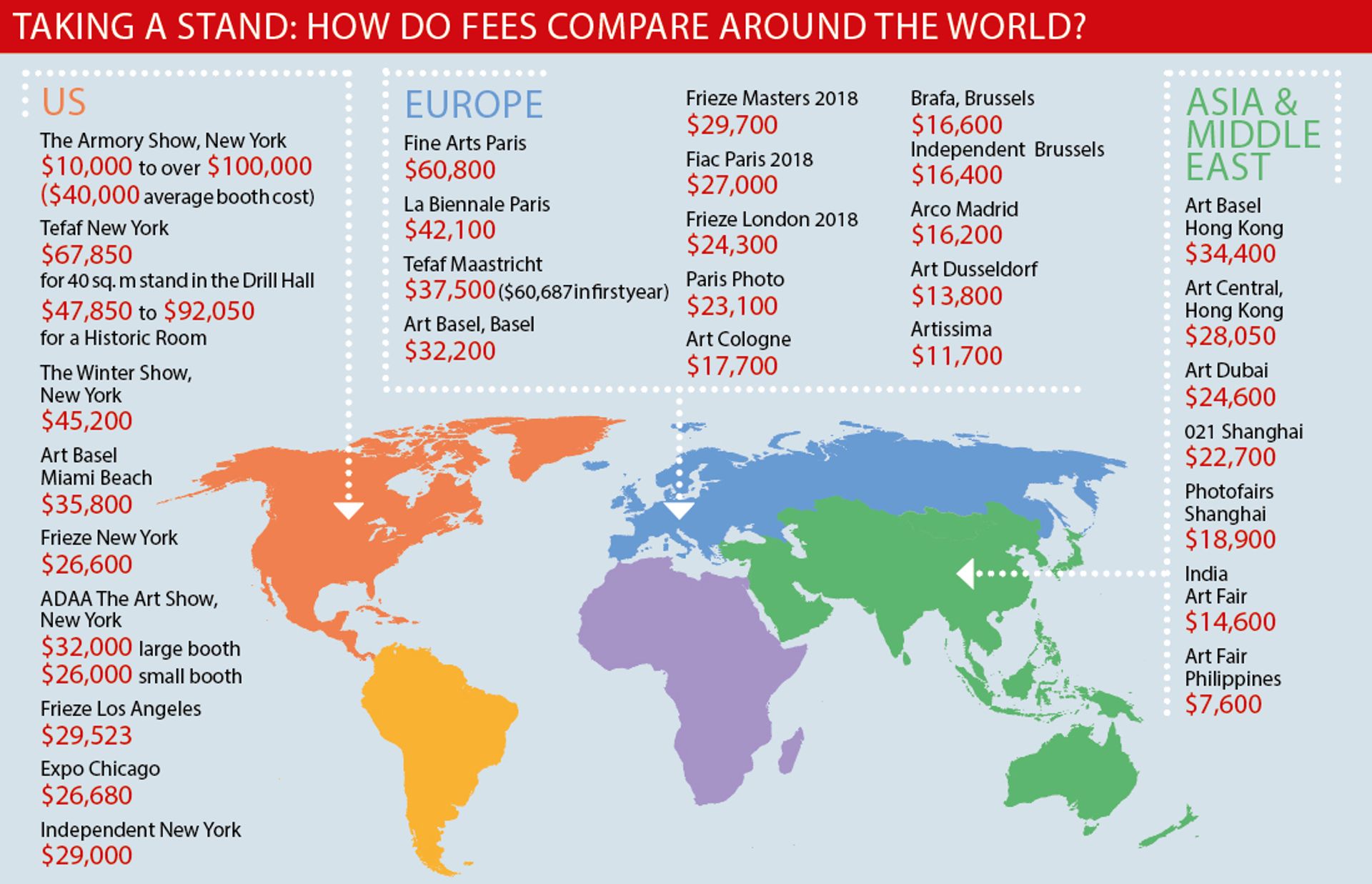 The figures shown here—though they include varying levels of stand fitting and should be taken only as a guide—illustrate how significantly costs vary around the world. While the map below concentrates on more expensive fairs, among the more affordable events contacted was Independent Brussels, where a 25 sq. m stand in the young galleries section costs around €4,000 (around $4,700).