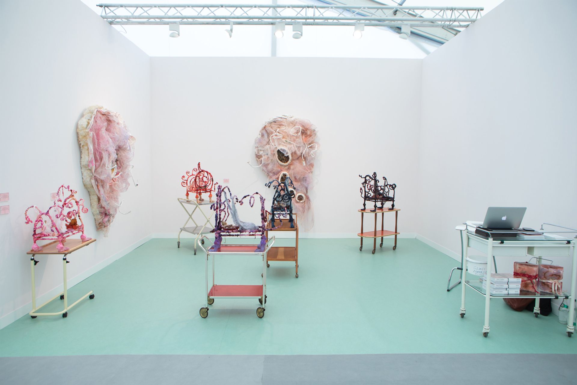 Athena Papadopoulos (born 1988), Emalin: The list of materials in the works by the Canadian artist Athena Papadopoulos is eye-opening, but also revealing about her subject matter. Take the work Iago Endometriosis Homicide Suicide (2018): one of several featuring beds displayed on hostess trolleys, it includes media such as glitter, hair dye, false eyelashes, make-up and hairspray. Papadopoulos uses these gendered consumer products alongside food and medical items to explore a “hyperfemininity” in these darkly fantastical creations. On the walls are two wedding dresses, spattered with painterly make-up and containing circular forms somewhere between detritus-filled birds’ nests and grotesquely exaggerated orifices, one held open by gynaecological tools. © David Owens/The Art Newspaper