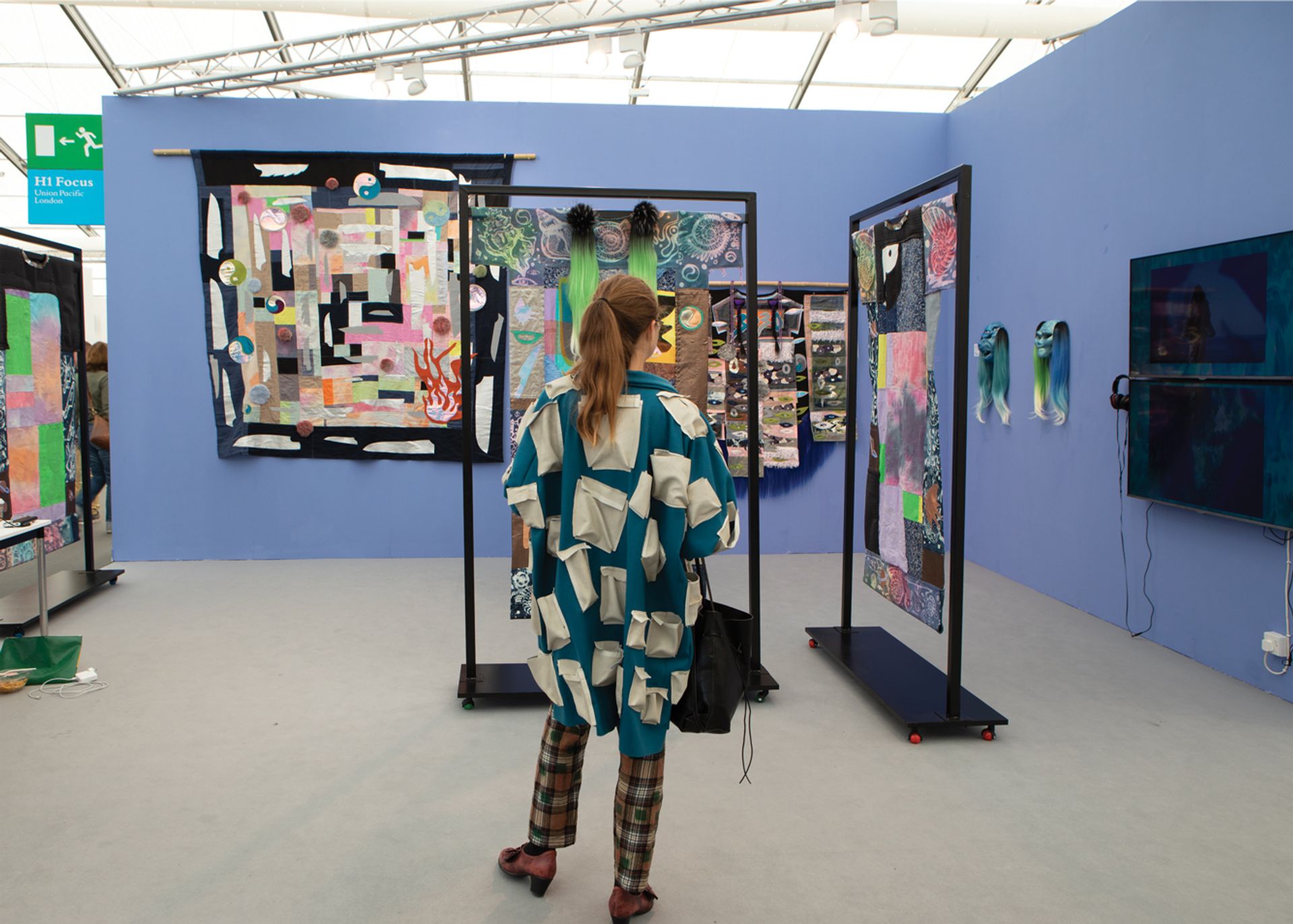 Zadie Xa (born 1983), Union Pacific: This is among the most exuberant stands at Frieze London, let alone in the Focus section. Beneath the liveliness, though, is a sense of longing. Xa was born to Korean parents in Vancouver and lives in London, and in the hand-sewn fabric works here, she explores her ancestral past and her present life away from Korea. Xa also reflects on Western perceptions of Asian identity. The fabrics teem with repeated imagery: yin-yang discs, knives and conch shells, each richly symbolic. The shells, for instance, refer to the semi-matriarchal culture of Jeju Island, off South Korea, and Haenyeo female divers, one of whom appears catching an octopus in a video on the stand. © David Owens/The Art Newspaper