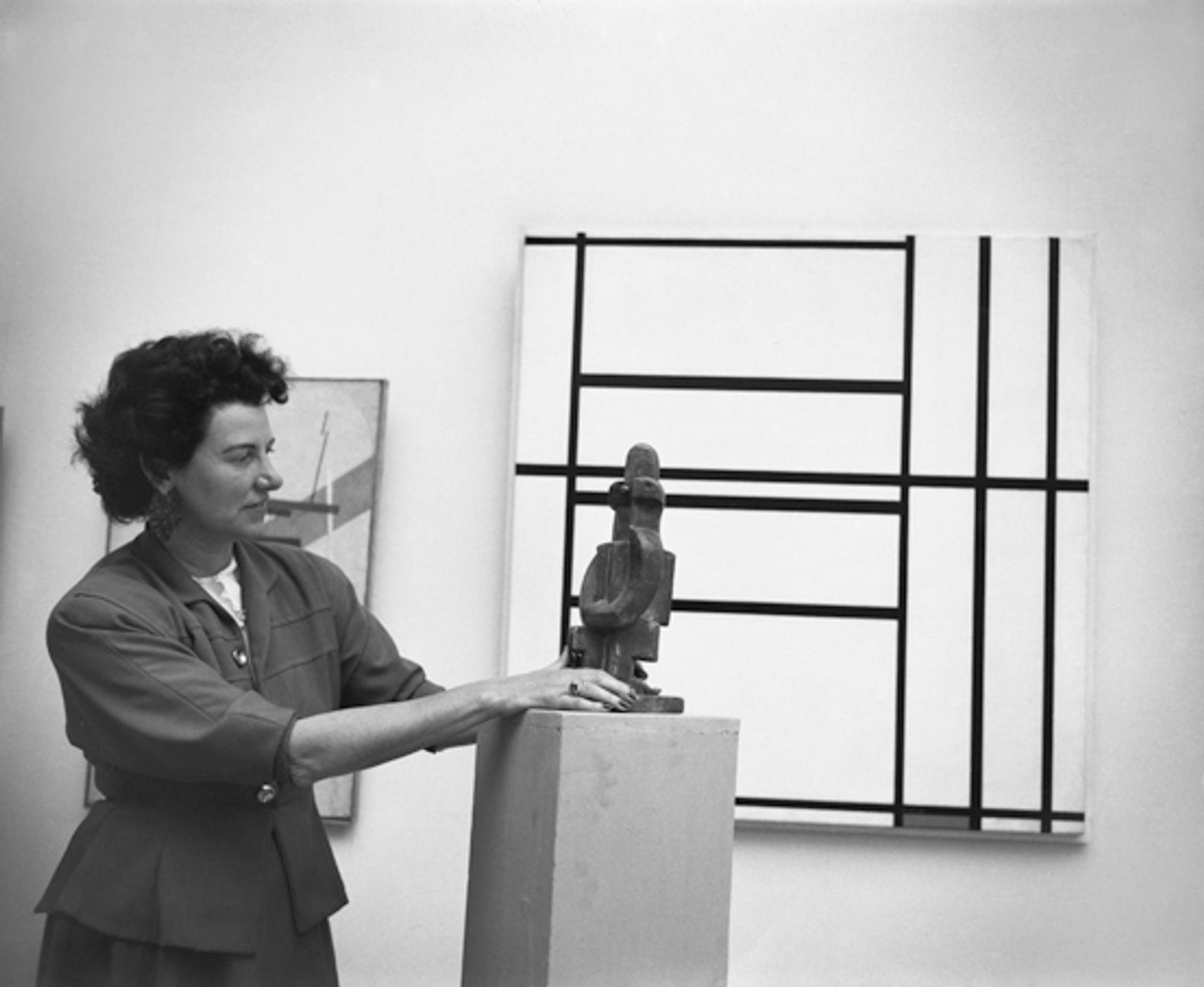 Peggy Guggenheim at the Greek Pavilion, where she exhibited her collection at the 24th Venice Biennale in 1948, next to Jacques Lipchitz, Seated Pierrot (1922); in the background Piet Mondrian, Composition No. 1 with Grey and Red 1938 / Composition with Red 1939 (1938-39) © Solomon R. Guggenheim Foundation. Photo Archivio Cameraphoto Epoche. Gift, Cassa di Risparmio di Venezia, 2005.