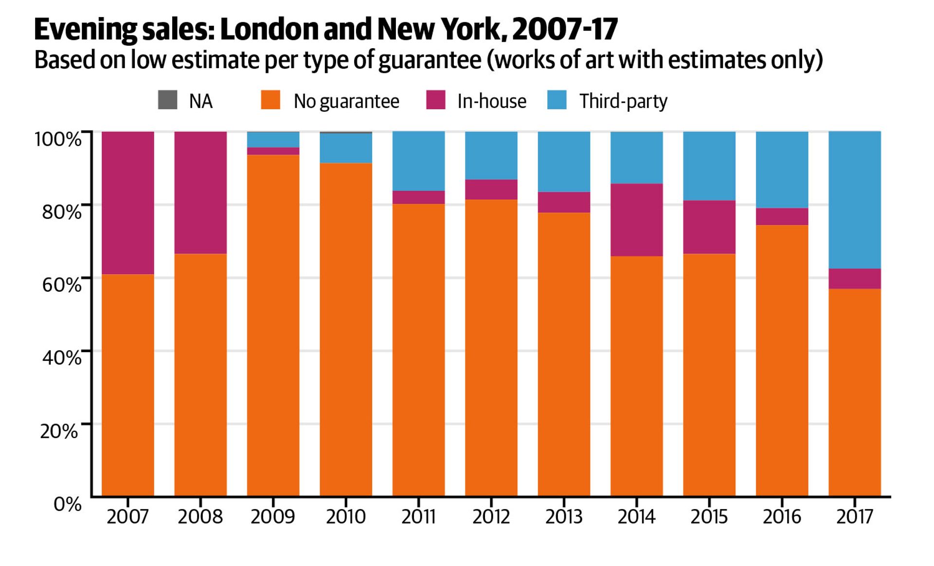 Pi-Ex’s data from Impressionist and Modern, and post-war and contemporary evening sales in London and New York over the past decade shows that although the number of in-house guarantees shrank dramatically following the financial crisis of 2008, works guaranteed by a third party have grown to 37% of total sales by value in 2017