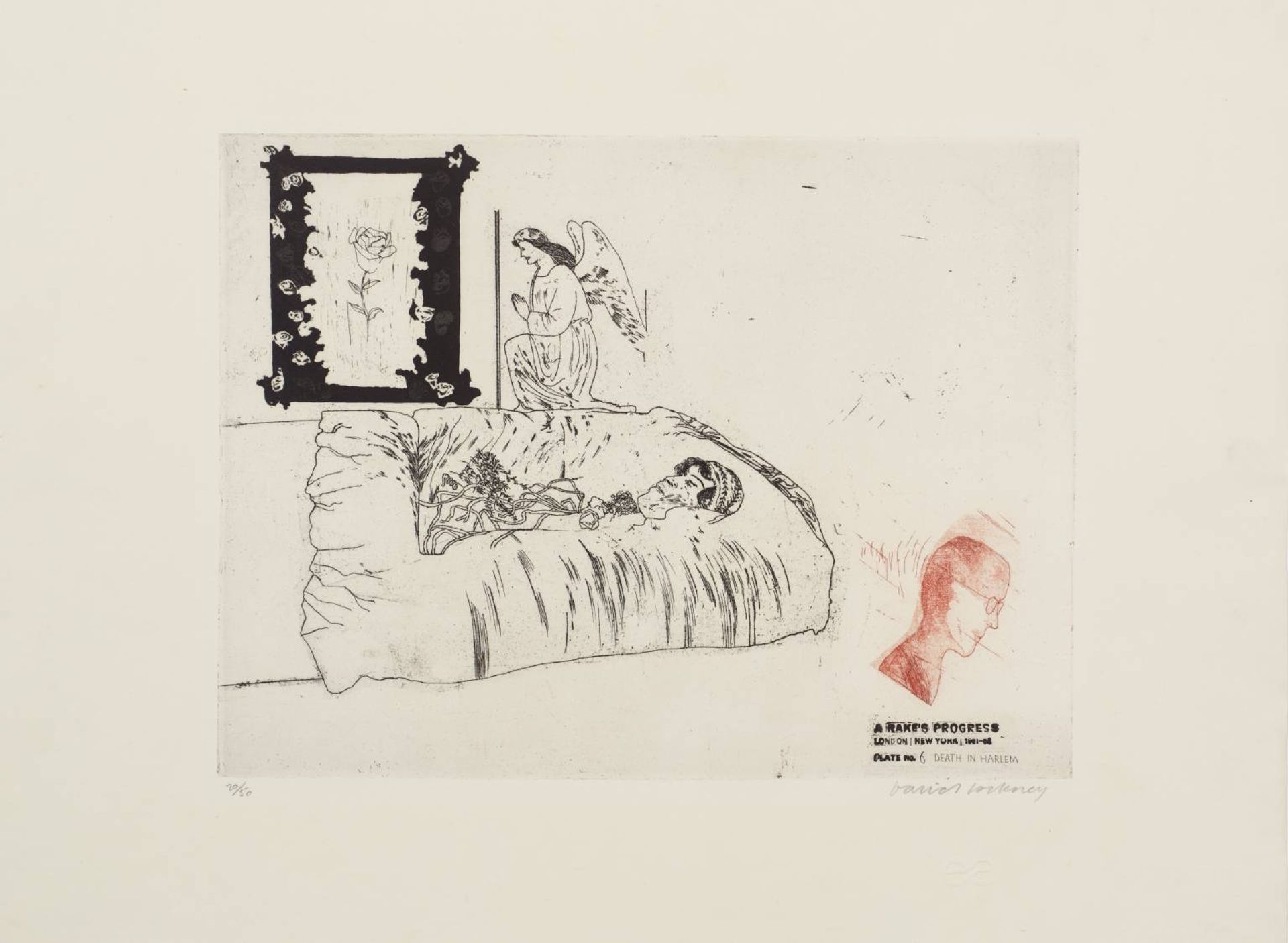 - On the importance of printmaking in his career, Hockney reminisces on how a lack of funds and sufficient materials to produce paintings led him to the etching department of the Royal College of Art, whereupon he produced a series of award-winning prints, the sales of which funded a trip to New York in 1961. Taken aback by the city's amount of homeless people which he says far eclipsed the numbers in London, Hockney was inspired to create a series of etchings entitled A Rake's Progress (1961-3).