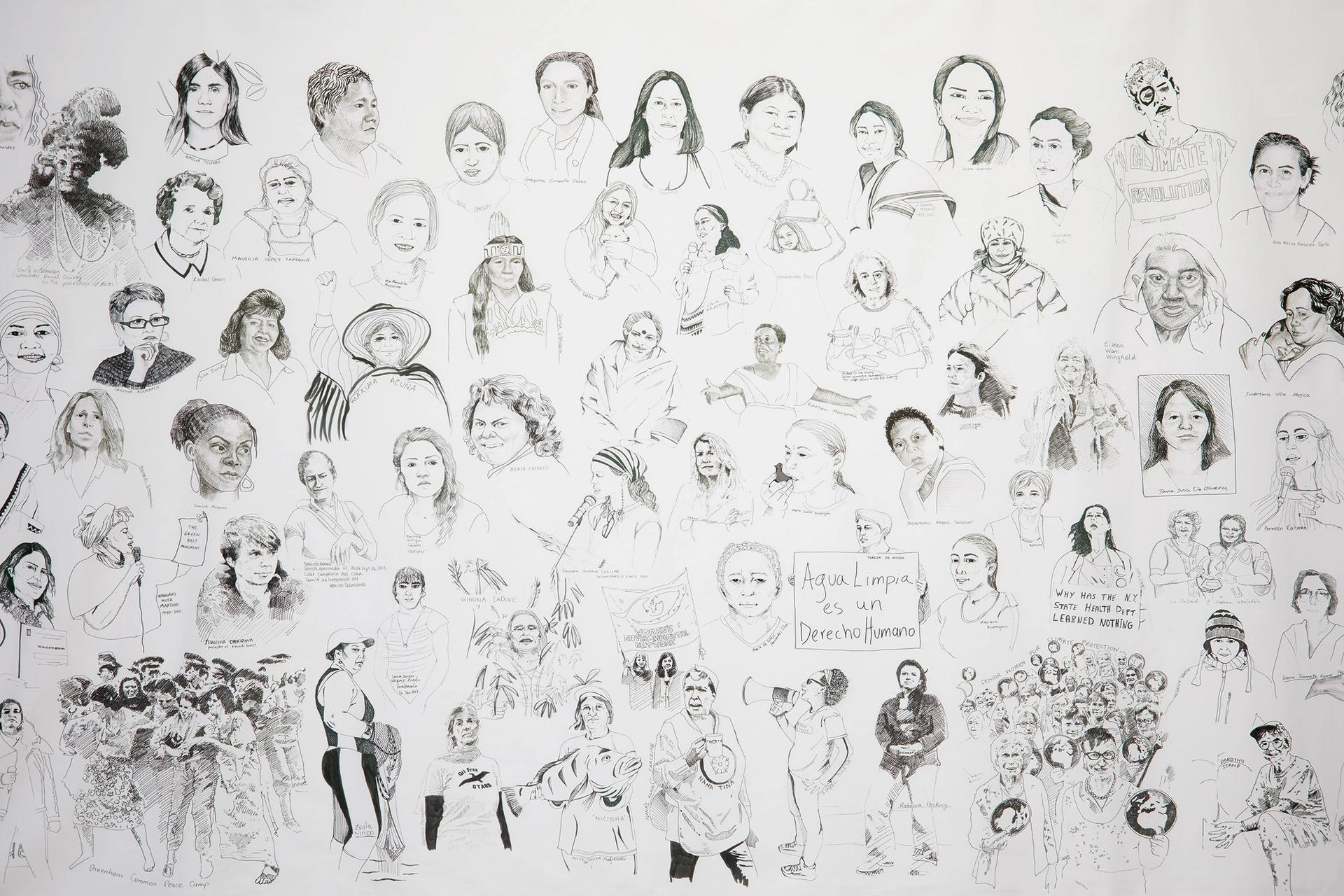 My pick is Carolina Caycedo’s new work, which is titled My Feminine Lineage of Environmental Struggle (2018). This work was made specially for the exhibition and gathers the portraits of over 100 women eco activists. This work is very significant for the exhibition as it traces the important role women have played in resistance movements against the destruction of the environment and for the right to access to land and natural resources by indigenous and local communities across the world. It also highlights the violent opposition eco activists are subjected to by large corporations, governments and other oppressive bodies. Many of these women have been incarcerated, assassinated or live under threats.