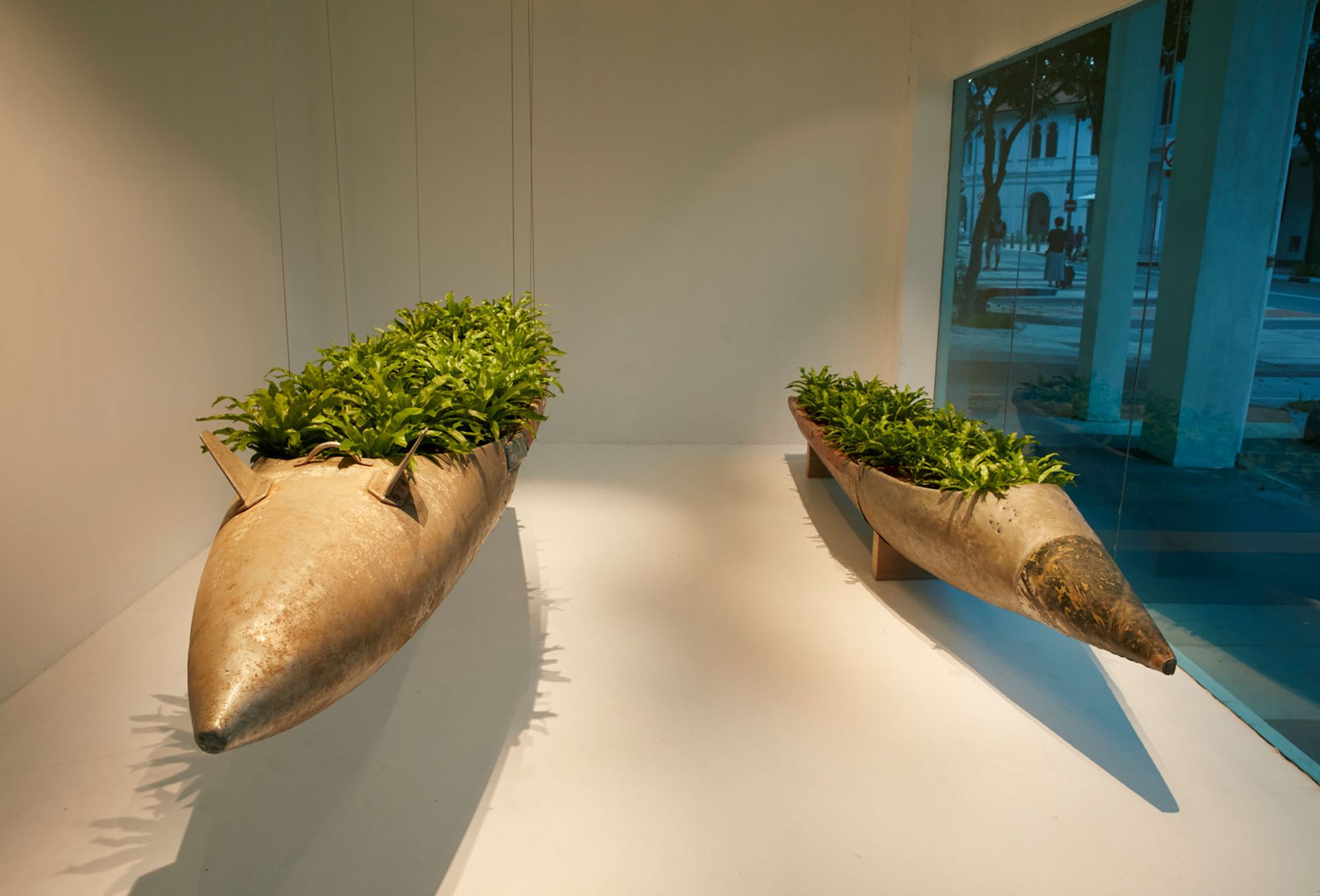 The theme of resilience is continued in the work of Bounpaul Phothyzan of Laos, the most extensively bombed country in the world. “There are lots of old bombs lying around and people would repurpose these,” Stanhope says. “They strip out the contents and turn them into things like canoes or supports for houses.” For Phothyzan’s APT9 work, the artist created beautiful suspended gardens by planting ferns in the bomb shells. These have been acquired by QAGOMA.