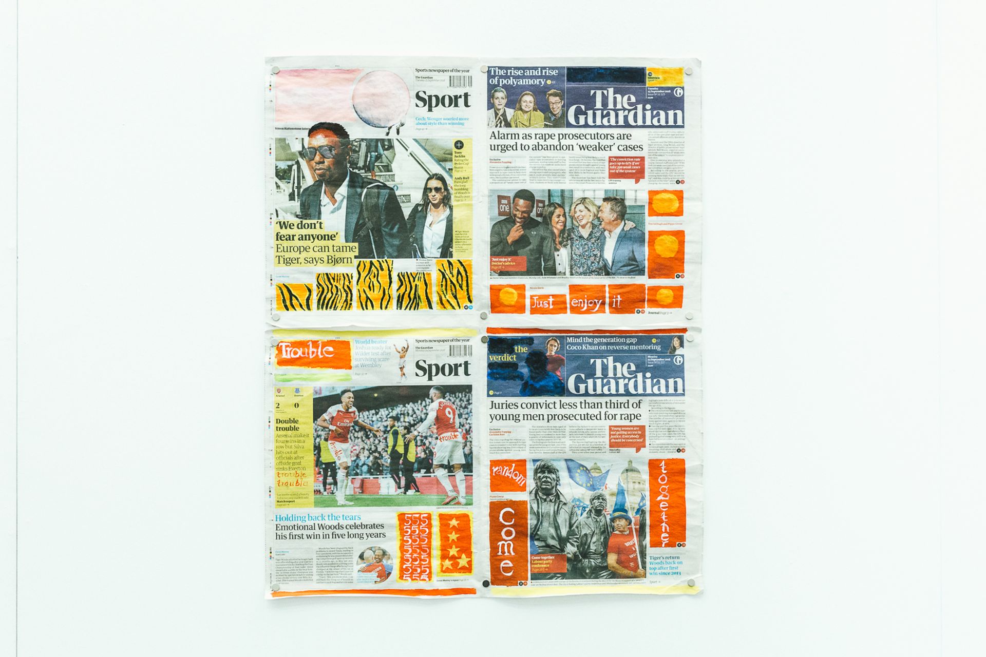 Himid’s main bugbear, however, is that when the newspaper is held open, the front page and the back page, which often features sports articles, appear side by side. This can create negative correlations, for example when a story about the footballer Paul Pogba was juxtaposed with another about the convicted sex offender Bill Cosby.