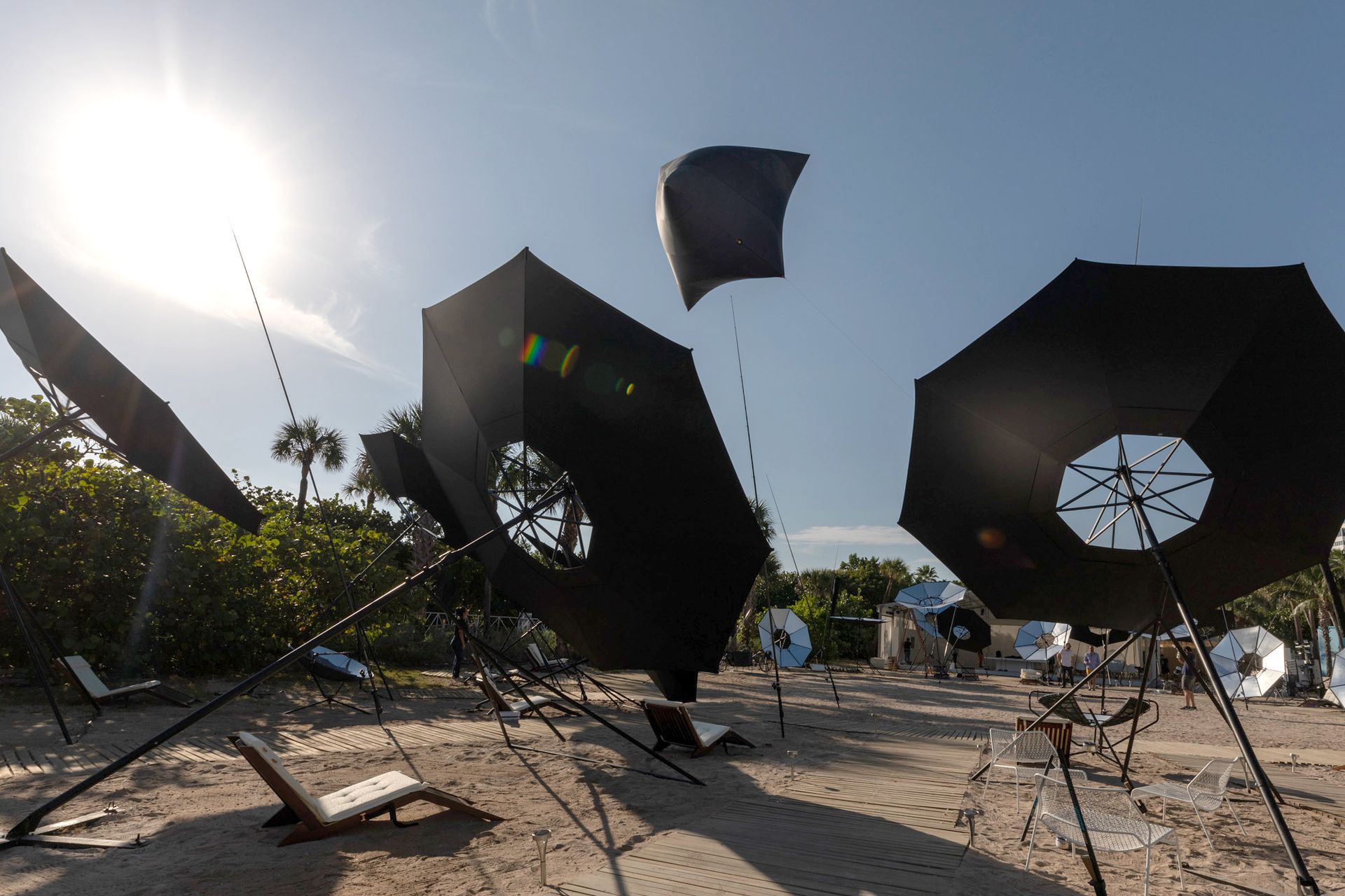The Argentine artist Tomás Saraceno is wowing the crowds in Miami this week with his scientific work of art powered by the Florida sunshine. His Albedo project—comprising a cluster of upturned umbrellas on the Miami Beach seafront—is stopping joggers and dog-walkers in their tracks. The project, sponsored by Audemars Piguet, harnesses the sun’s energy, sending the kite-like Aerocene Explorer sculpture floating into the dazzling Florida sky (although if it’s overcast, the object cannot take off). Saraceno’s ad-hoc solar panel is also feeding local residents. “We’re cooking food provided by eco-farmers from the region,” the artist says. “We’ve been cooking peppers and tamales, and handing them out to homeless people. I want to cook food in my studio [using Albedo], but it might be a bit harder in cloudy Berlin.”