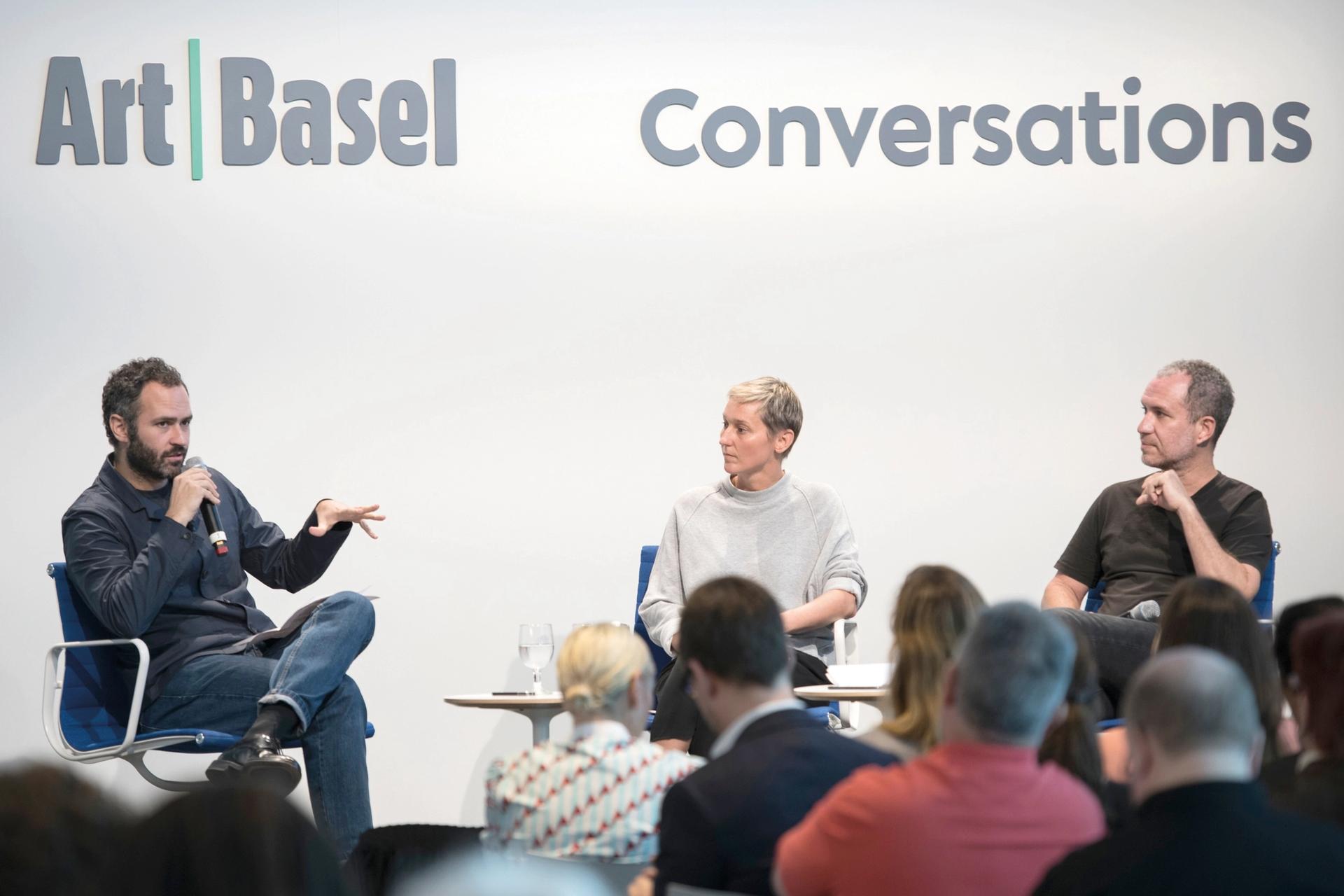 Manuel Cirauqui, curator, Guggenheim Museum Bilbao, with Jennifer Allora and Guillermo Calzadilla at Art Basel in Miami Beach 2018 Photo courtesy of Art Basel