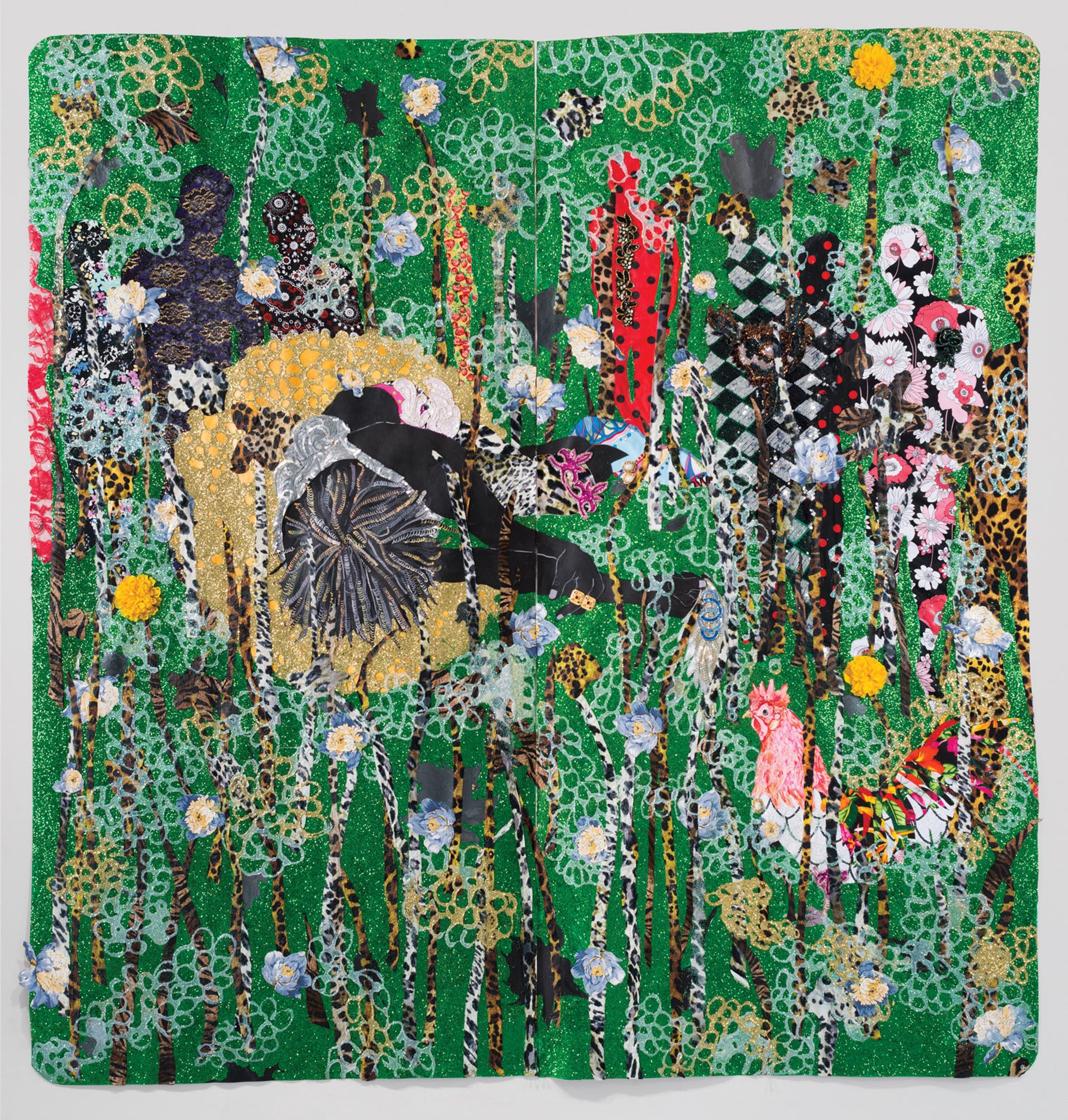 The Jamaica-born, US and Jamaica-based artist Ebony G. Patterson describes her immersive exhibition at the Pérez Art Museum Miami (Pamm) as the “most intense” installation process for a work she has done so far. The 37-year-old, who considers herself a painter but works in multiple media, uses materials associated with beauty or wealth, including tapestry, jewellery, glitter, beading and crochet, to explore intersecting themes such as global black youth culture (including Jamaican dancehall), class, race and gender norms and pageantry. Organised by Pamm’s chief curator Tobias Ostrander, the show features six new commissions and seven other works from the past five years, including videos, mixed-media installations, paintings and embellished tapestry pieces. Titled …While the dew is still on the roses…, a reference to a popular hymn describing an encounter with God in a garden, the exhibition explores Patterson’s repeated use of such landscapes, including the garden as an extension of the body. There is a transformation of the works on view into one large “night garden” installation, with twilight-coloured wallpaper, vegetation growing up the walls and silk flora falling from the ceiling. We spoke with Patterson about the “muchness” of her ornate works, the seductive trap of beauty and her relationship with Miami.