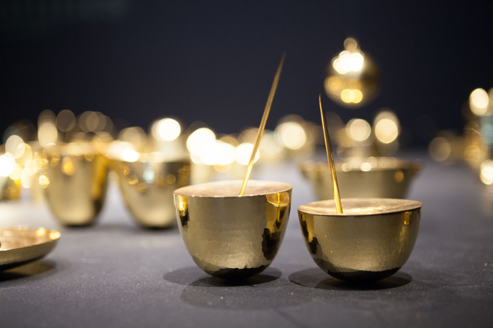 This hoard of 100 simple, golden forms by Nadja Zerunian belies the complexity of the Austrian designer’s inspiration— relationships. The titles range from Deceptive Submission to Decisive Loyalty. “I was inspired by a photograph of Alberto Giacometti with one of his muses and the complex relationship between them,” Zerunian says. The small objects—bowls, jugs, balls and spoons that touch and balance on each other—are made from copper, silver, brass and gold, in collaboration with Transylvanian Roma artisans. Nadja Zerunian, Liabilities (2018). Curio section; $2,400-$3,200. Photo: © Vanessa Ruiz