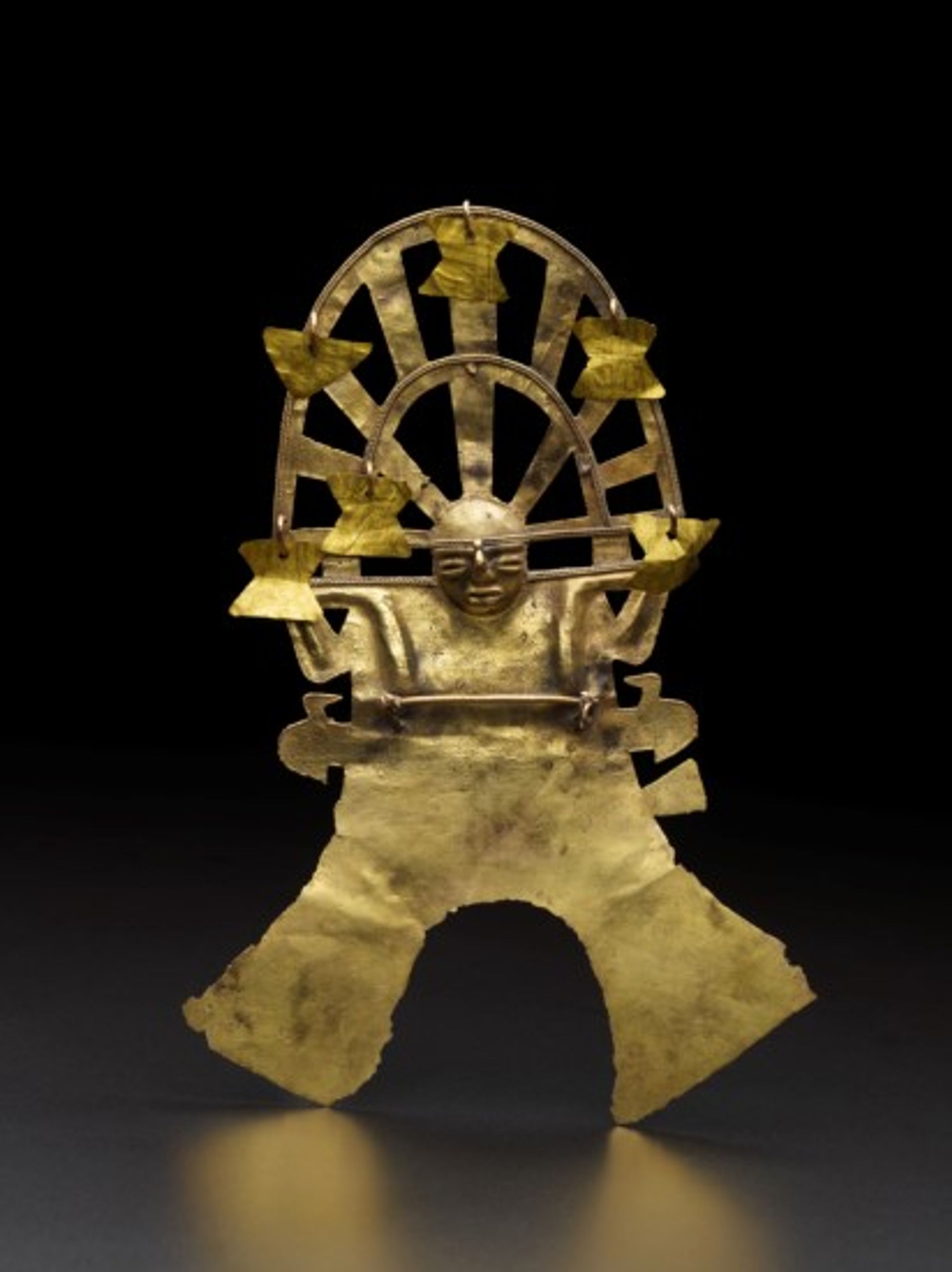 A hammered gold Shaman Pendant, 600-1500, from the Muisca people Gift of Alfred C. Glassell, Jr, Courtesy of the Museum of Fine Arts, Houston