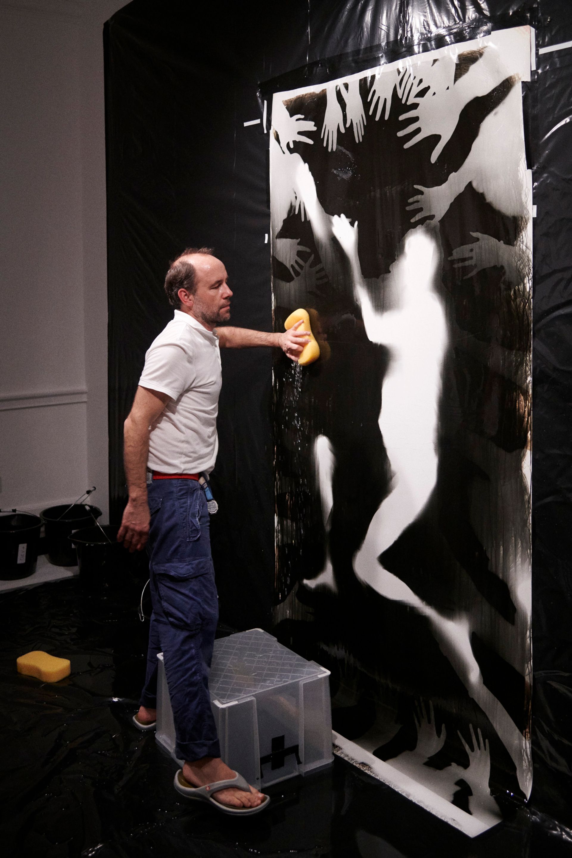 The event was especially poignant since Ulay is now very weak with the return of the lymphatic cancer which inspired his 2013 film Project Cancer. It took all of his strength to get himself out of the chair from which he had received guests and to lie on the photosensitive paper which was covering the darkened back gallery floor. The surrounding audience — which included artist Mark Wallinger, art dealer Ivor Braka and his wife the model Kirsten McMenamy, the Tate curator Fiontan Moran and the creative director of Frieze Masters Nathan Clements-Gillespie — was instructed by the artist to reach out their hands over his prone body so that when the paper was exposed to the light their silhouetted handprints became part of the image, framing Ulay’s shadowy form. Almost immediately afterwards Ulay left the gallery, his energy depleted, but leaving this powerful and moving image in his wake.