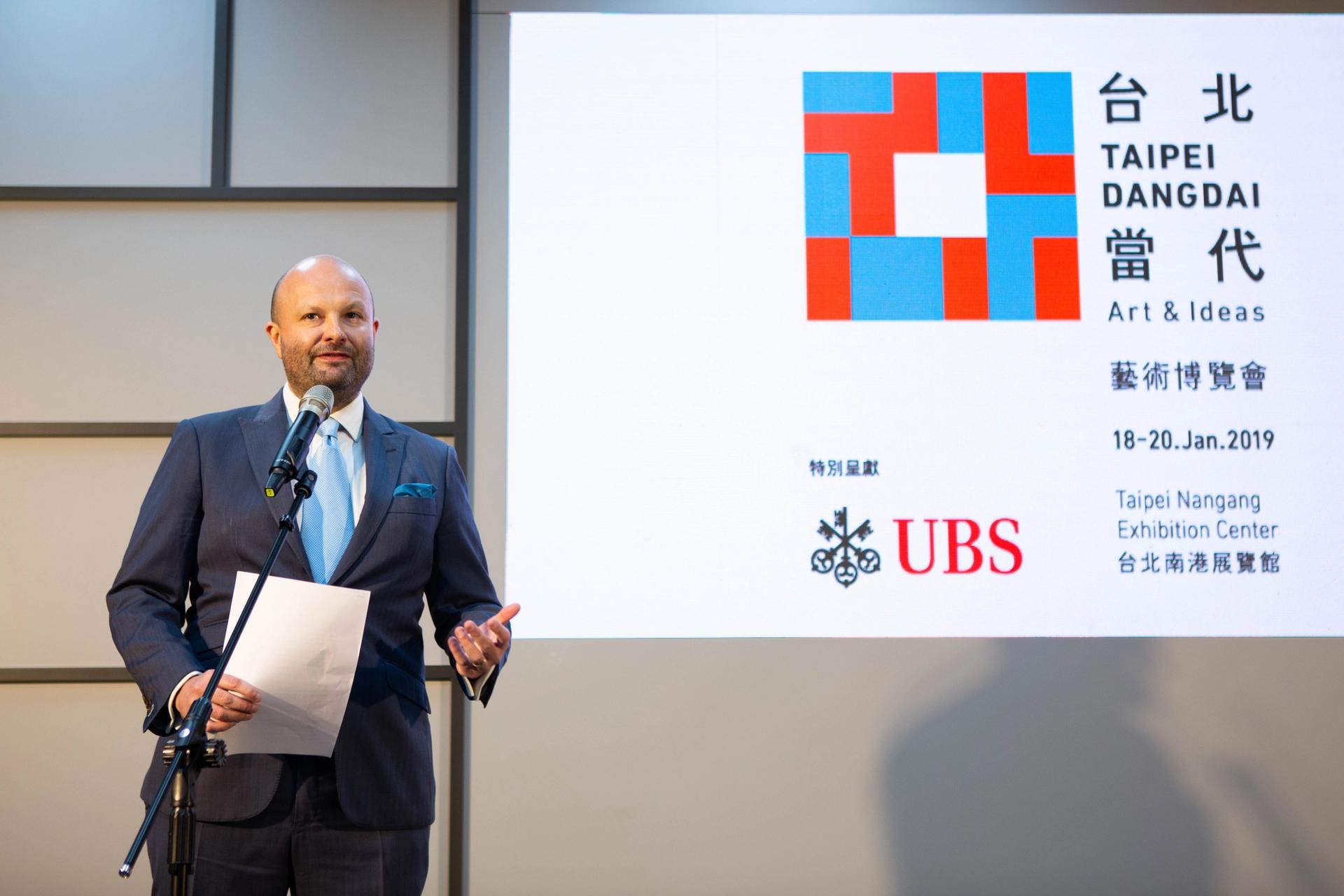 Magnus Renfrew, the director of Taipei Dangdai, announces the programme highlights at the press conference of the inaugural edition of the fair. Courtesy of Taipei Dangdai