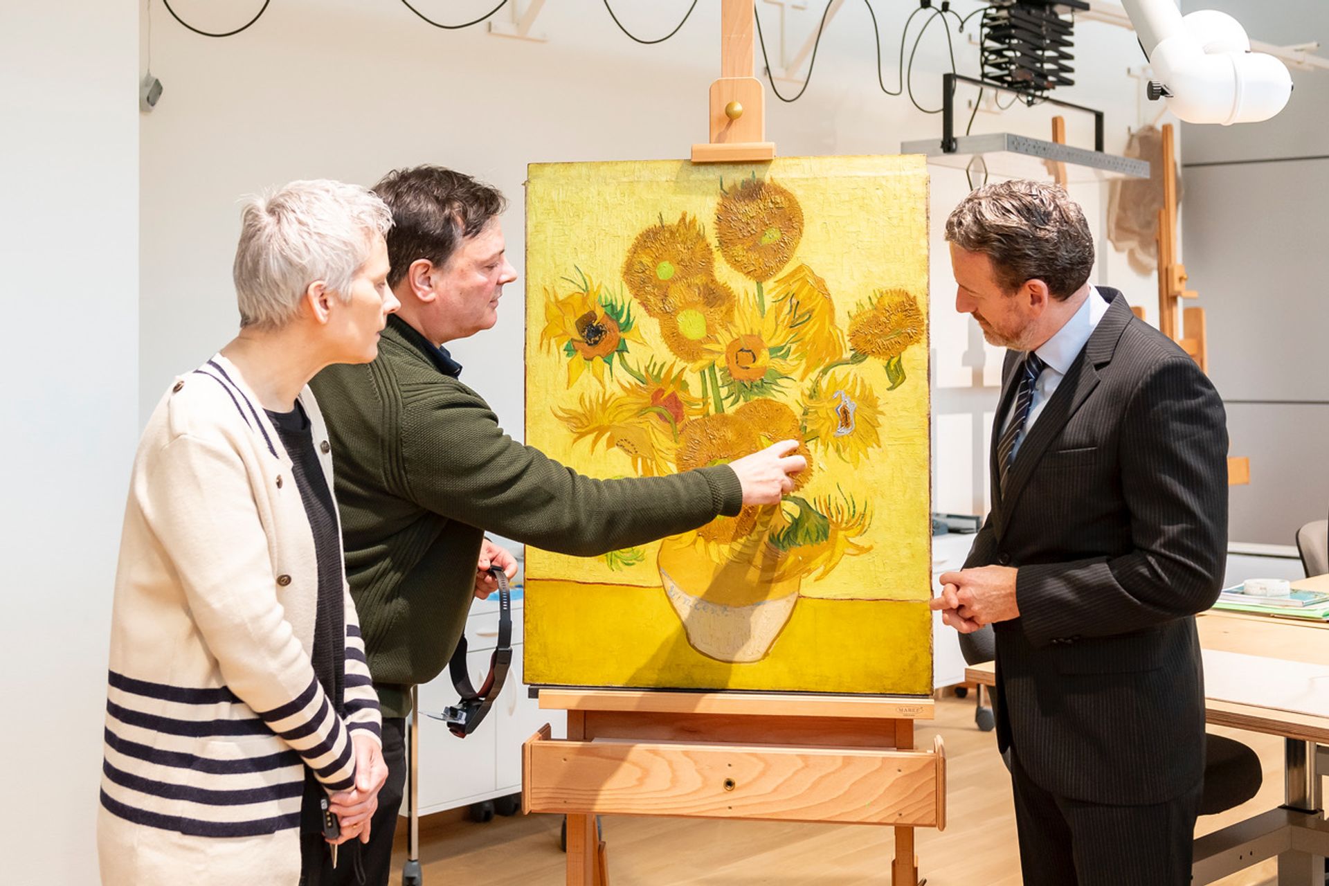Sunflowers in the conservation studio with conservators Ella Hendriks and René Boitelle with museum director Axel Rüger, January 2019 Courtesy of the Van Gogh Museum, Amsterdam