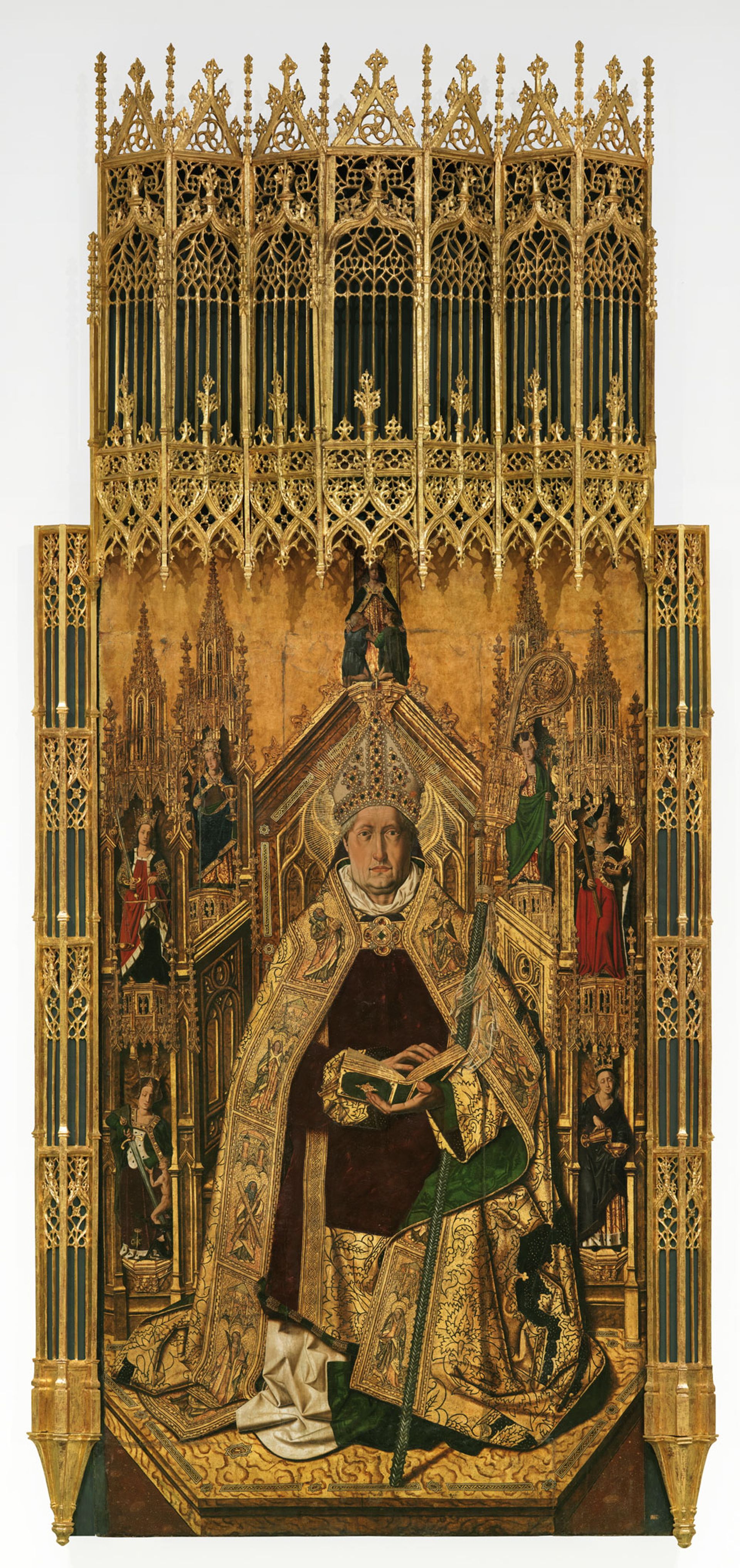 As far as Bermejo was concerned, “a window on the world” was not the goal of a painting—his approach is modern in itself. The show and book argue that the overall effect of his style is “replacement realism”. There is so much splendour in the portrait of the St Dominic, so much gleam and zesty colour, that we advance beyond the mere subject toward sensual experience, zones between matter and illusion, and finally to abstract or spiritual thought. Pulling and pushing us back and forth is the frankly physical Dominic himself, serious but so fleshy and puffy he defines any generic conception. Most of Bermejo's people have this Everyman and Everywoman particularity. Dominic is both mortal and mysterious. Illusionistic niches pull us in, and a profusion of gold push us out. Fake architecture and the real three-dimensional tracery heighten the tension between fiction and reality.