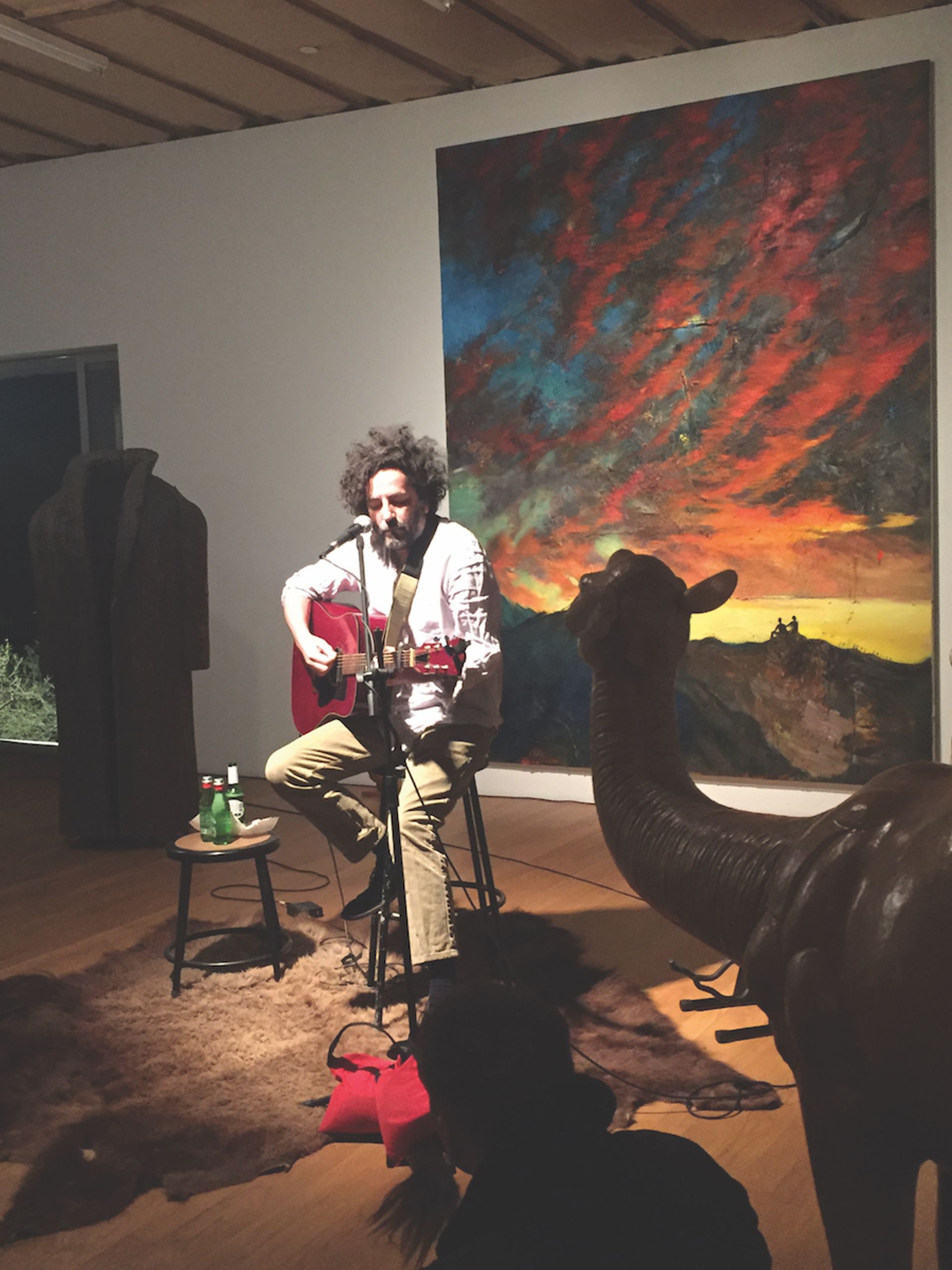 There’s a certain candor in Friedrich Kunath’s paintings, which often have text crossing lush, romantic landscapes like an aerial banner with no airplane, that pairs well with music. For the launch of his monograph, I Don’t Worry Anymore, which includes contributions from a substantial cast of characters—the poet Ariana Reines, the novelist James Frey, and the former tennis player-turned-art collector John McEnroe—Kunath invited the Canadian troubadour Daniel Bejar, aka Destroyer, to perform in front of one of those dreamy landscapes. The upstairs gallery at Blum & Poe was packed (whether there were more people there to support Kunath or to see Destroyer, we may never know) and Destroyer’s songs felt exactly right: romantic without being mawkish, funny without being inane. The musician and the painter were a pairing no DJ could have mixed better. “This is big for me,” said Kunath, who was a huge fan of the musician. Bejar played a mix of old and new songs while propped on a stool on top of a bear rug with a camel sculpture in front of him. “I want to thank Friedrich for letting me out tonight,” he joked. “It’s nice to get out of Canada once in a while.”