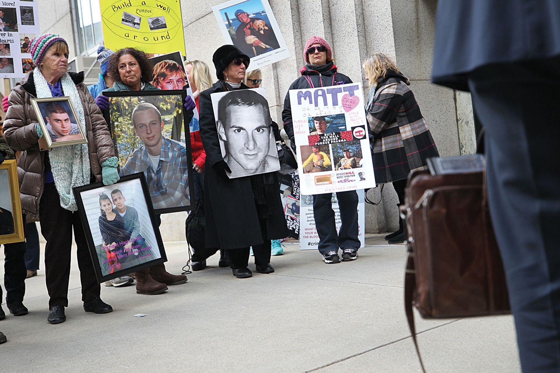 Families affected by the US opioid crisis protest in front of Suffolk Superior Court in Boston as lawyers for Purdue Pharma enter the courthouse for a status update in the Attorney General's suit against Purdue Pharma on 25 January © Suzanne Kreiter; courtesy of The Boston Globe via Getty Images