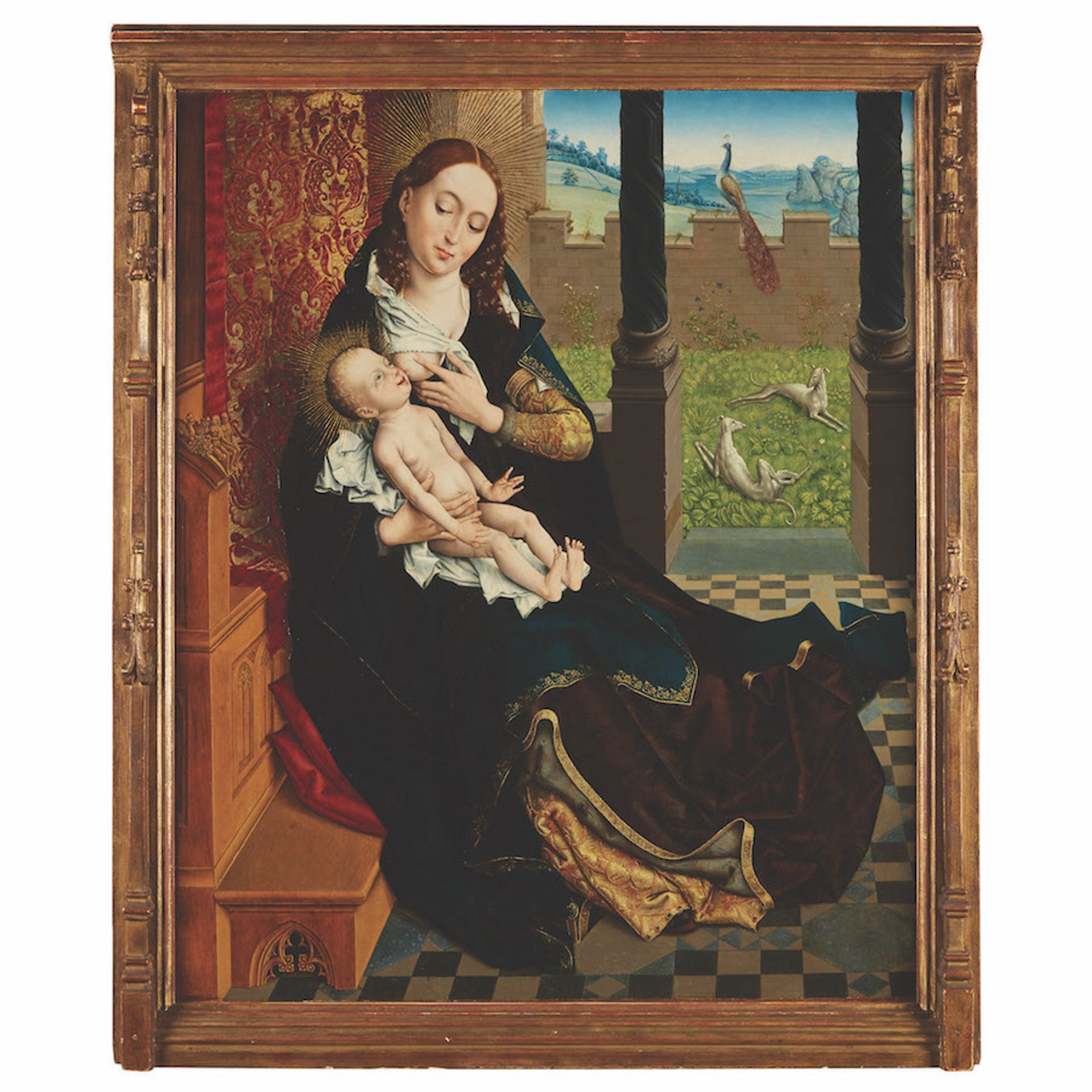 The name Master of the Embroidered Foliage was coined in 1926 by the German art historian Max Jakob Friedländer, who likened the particular way this artist (or group of artists) active in Brussels at the end of the 15th century rendered flora in distinctive brushstrokes that resemble embroidery stitches. The Nursing Madonna was among the first paintings to be attributed to the Master, and specialist Raphaël Chatroux says the painting is a “dazzling” example of the painter’s idiosyncratic technique: “Its sense of detail reveals a prenaturalistic sensitivity, a true testament to the urban Europe of the 15th century, which explored a new artistic freedom that would ultimately give birth to Humanism.”—Margaret Carrigan