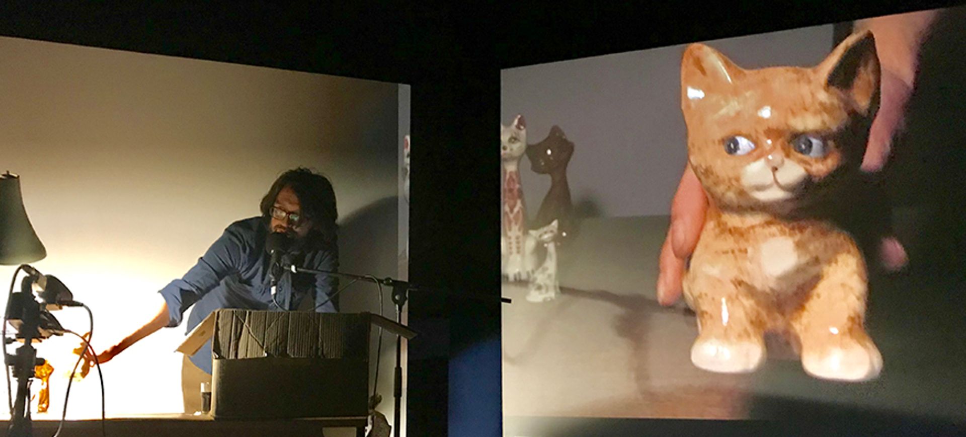 Friends and family were at the centre of the second part of the evening. Accompanying Holden on the piano was his fellow Grubby Mitts band member Roger Illingworth (who had featured in the earlier film). With his mother also in the audience, Holden unpacked some of the 300 ceramic cats that he had inherited from his grandmother, who never herself owned a cat. Projected onto two large screens, often striking dramatic poses and sporting some highly eccentric body decoration, this feline throng (all sourced from charity shops) seemed utterly at home in this shrine to the golden age of cinema. I feel Charlie Chaplin would have approved.