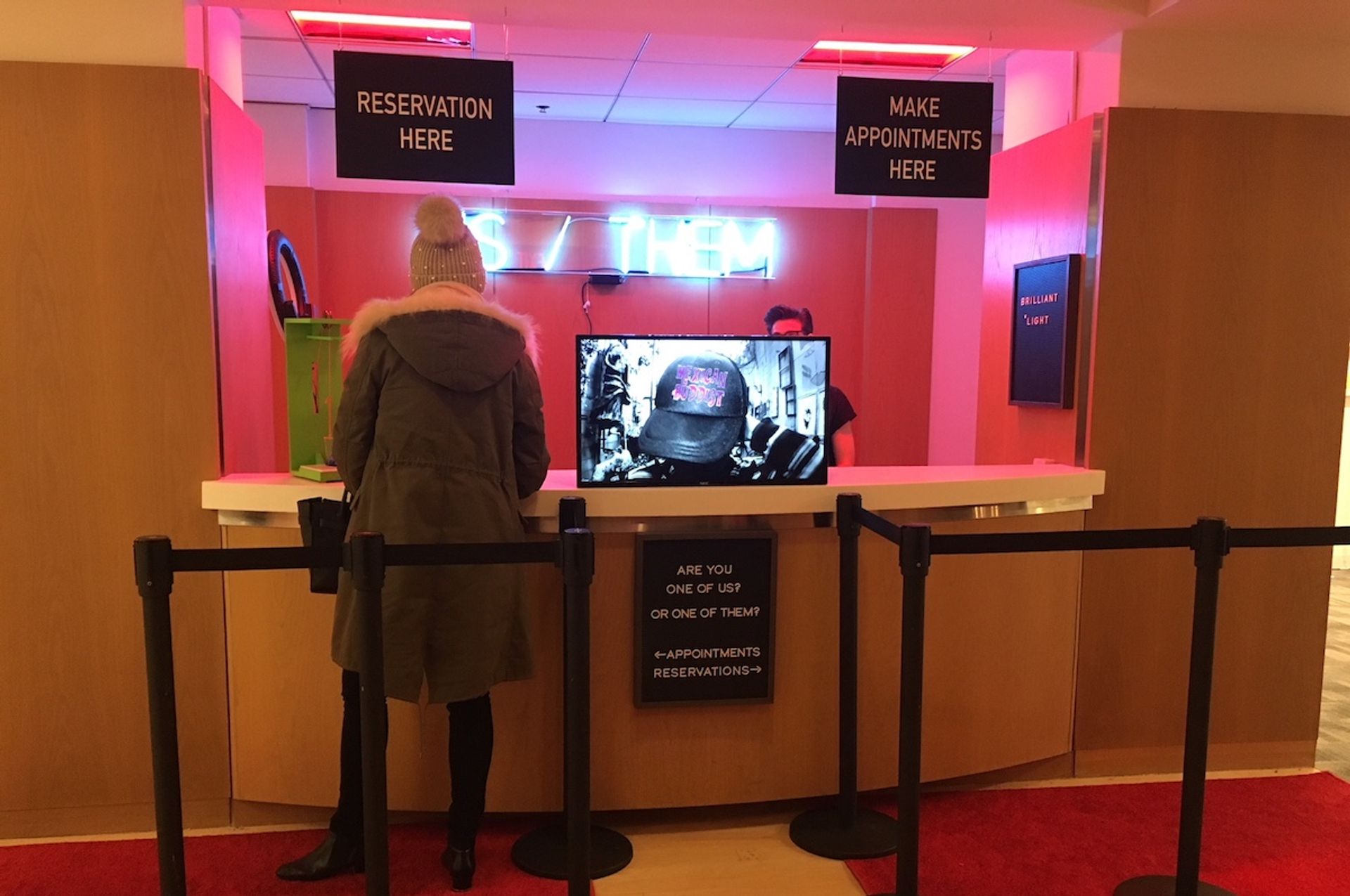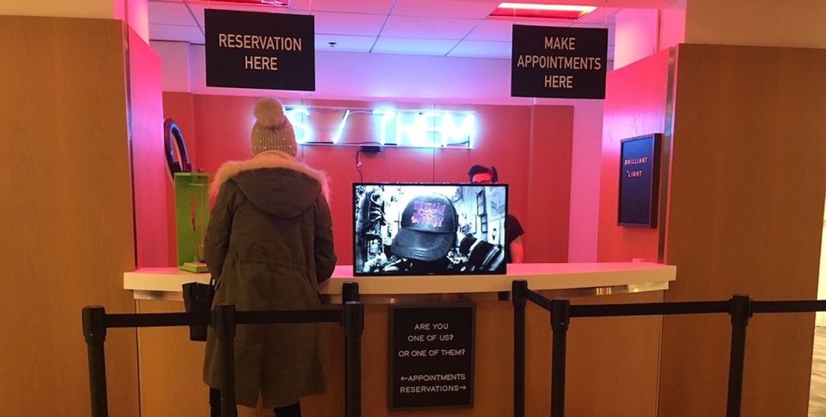 In this interactive performance, the American artist Jonathan Paul swings a pendulum to determine whether each participant as “one of us” or “one of them”, a reference to the science fiction film Brazil by Terry Gilliam. Partakers walk away with their designation printed on a lanyard bearing their photograph and a description of what the nomination means. Those who are "one of us", “seek conversations with those who don’t echo your beliefs in order to flex your mind”, among other desirable traits. The artist says he was “feeling as polarised as the rest of the world has been for the last couple years”. He adds: “Randomly selected differences pit us against each other at birth, and this performance was an honest way to process what has been happening in recent years”. Jonathan Paul's performance Us/Them, 2019.