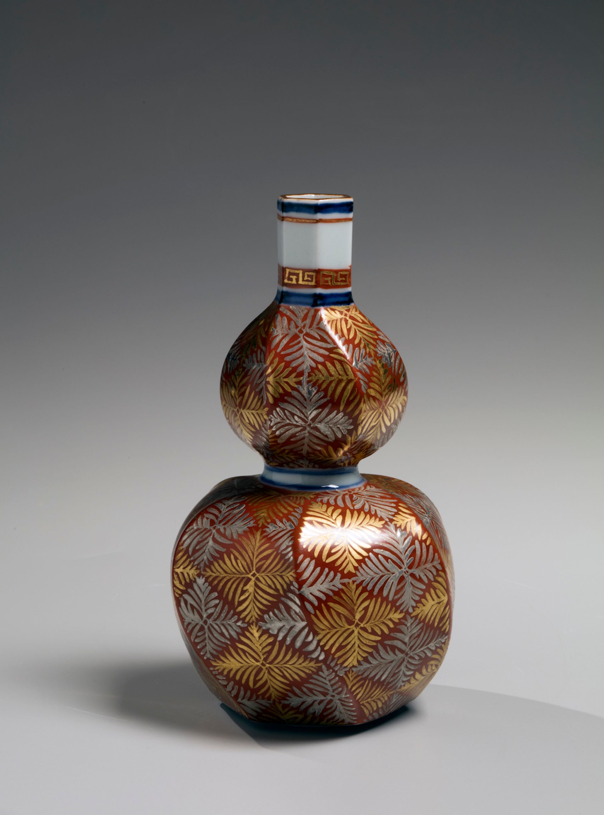 Tomimoto Kenkichi, glazed porcelain with gold and silver glazes and over red overglaze, made after 1952 Joan B Mirviss