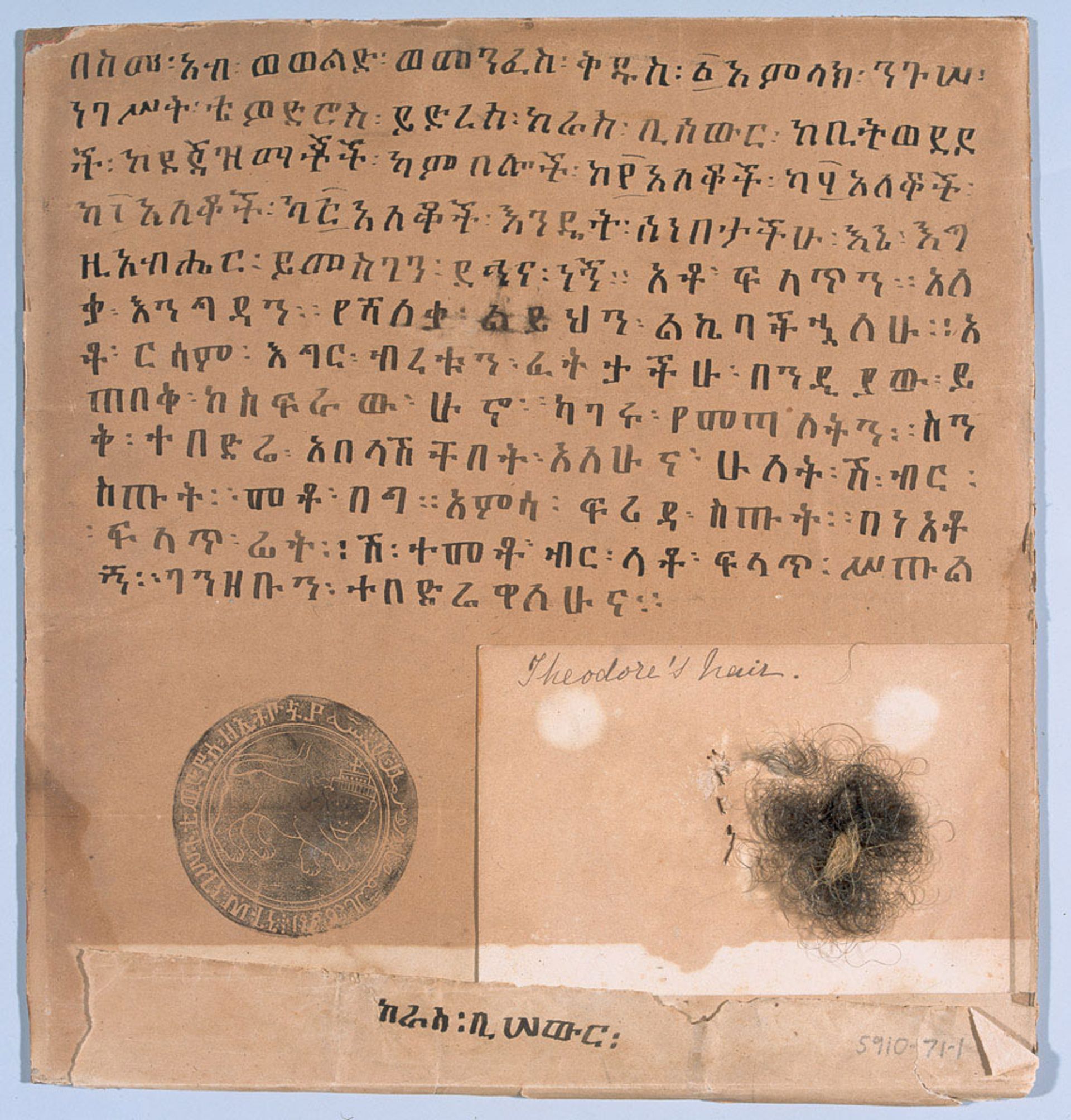 This gruesome souvenir had been taken by Lieutenant Frank James just after the emperor’s defeat by the British. He was an artist and cut the hair while he was painting Tewodros on his deathbed. Two of James’s descendants gave the two locks to the National Army museum in 1959, one of them mounted on paper with an Ethiopian text and a seal (this document is being retained by the museum, since it is not human remains).