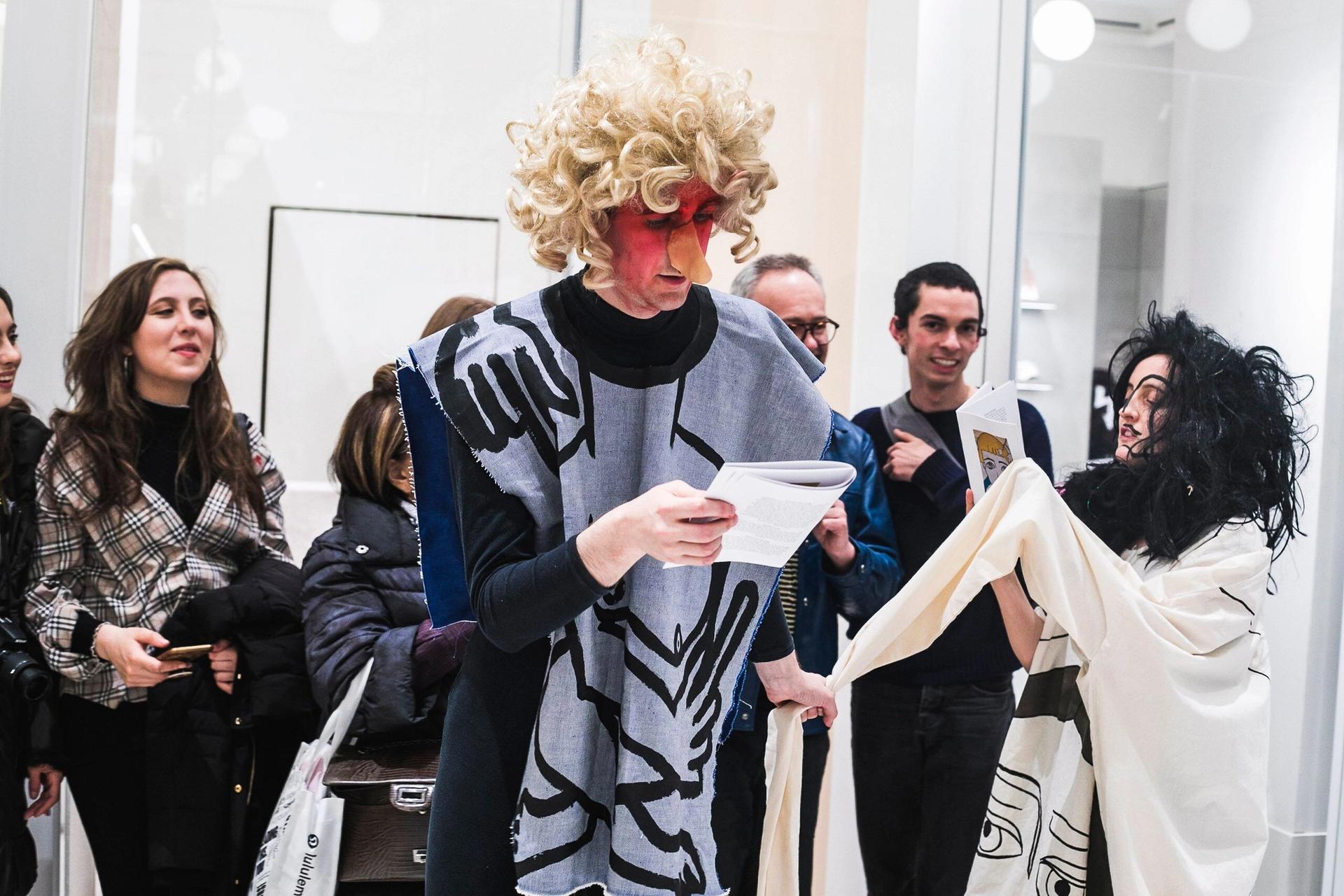All the action from this motley crew took place in and around a battered industrial skip, incongruously deposited between the Gucci and Chloe outlets which Kindersley has draped with banners painted with Cocteau-esque figures to become the "Ship of Fools" itself. In another twist, the repurposed skip also doubles up as the art gallery that has commissioned Kindersley’s performance. For the Skip gallery is precisely that, a mobile art space housed in a modified skip. Founded by Catherine Borowski and Lee Baker in 2017, this antithesis to the White Cube has already collaborated with Gavin Turk, Richard Woods and David Shrigley to unleash “eruptions of art” in unexpected places from Hoxton to Bristol. With Kindersley’s Ship of Fools it continues to do so with a vengeance.