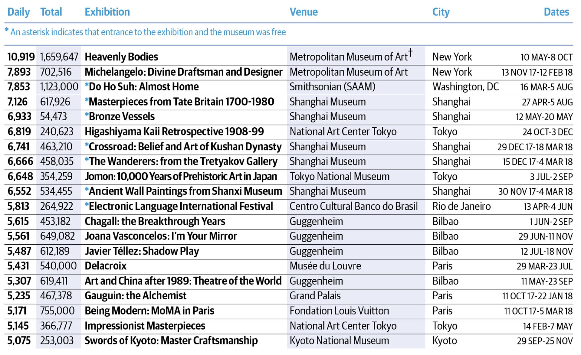 The Fondation Louis Vuitton in Paris and the Melbourne’s NGV International both benefited from the Museum of Modern Art (MoMA) in New York’s decision to send works from its collection abroad during its building works. Their MoMA shows drew 5,171 and 3,312 daily visitors to the French and Australian museums respectively. Meanwhile, MoMA’s desire to give over its entire sixth floor exhibition space to Adrian Piper proved popular as the US artist’s work, which addresses issues such as racism and sexism, was a surprise hit (3,993 visitors a day).