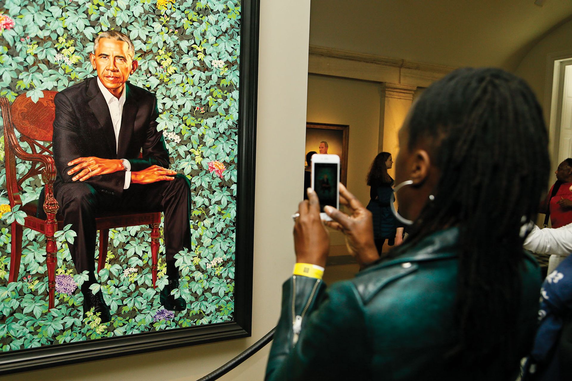 A visitor snaps Kehinde Wiley's portrait of Barack Obama at the National Portrait Gallery in Washington, DC © Photo courtesy of the National Portrait Gallery; Paul Morigi; 2018