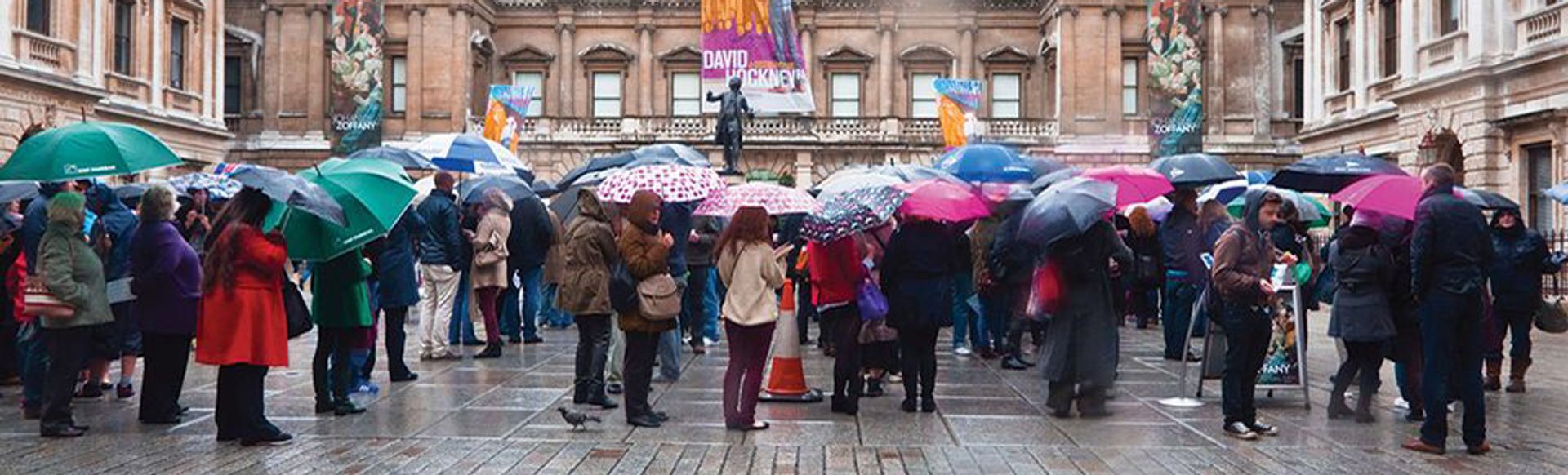 Massive queues for the David Hockney exhibition at the RA in London—even in the rain Photo: Foto-Call/Alamy Stock Photo