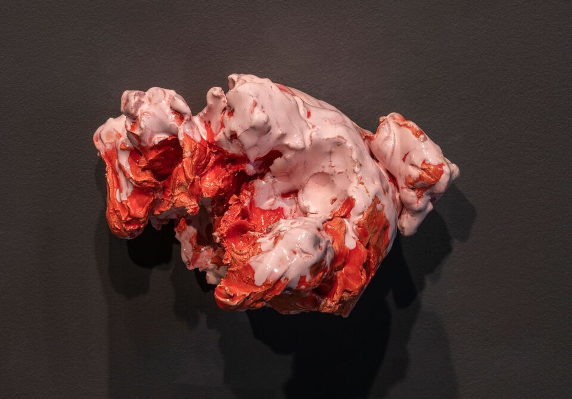The hands-on activity provided an affirming finale to a starkly emotional and characteristically multilayered show which turned the gallery into a dark cave-like space with walls painted dark-brown and marked with clusters of gestural paint-smears, clots of clay and expressive paintings of wailing open-mouthed heads. Dotted throughout were glazed ceramic ‘empathy objects’ which appeared to have been scrunched in anguish.