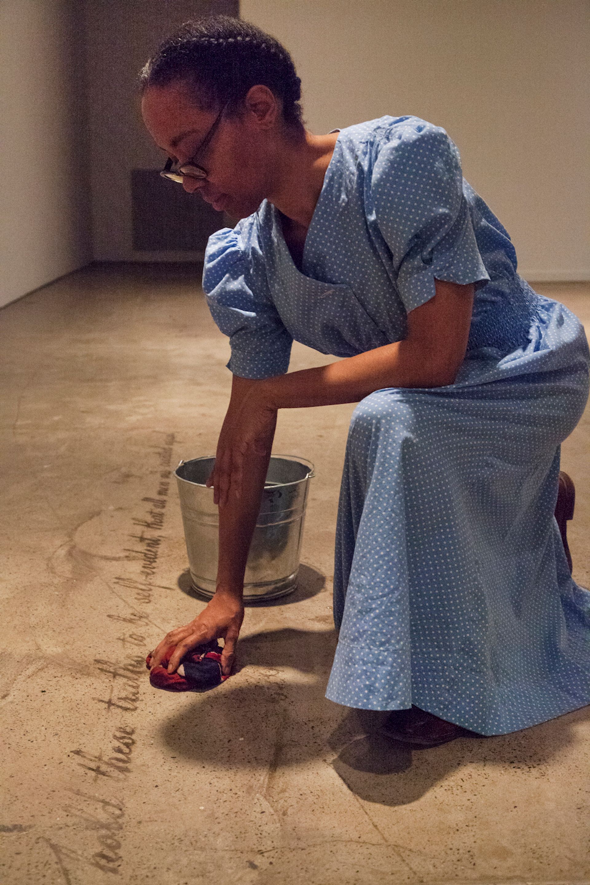 Dressed as Ella Watson, the African-American cleaning woman pictured in Gordon Parks’ 1942 photograph American Gothic, Clark opened the exhibition on Saturday (30 March) with a performance called Reversals where she cleaned a dusty concrete floor with a commercially available dishcloth printed with the Confederate battle flag. As Clark wiped away the dust, she revealed snippets of text from the Declaration of Independence etched on the concrete. And each time the artist moved to another spot with her bucket, she would go down on one knee as a reference to the football player and Black Lives Matter activist Colin Kaepernick. The 20-minute piece was recorded and is now on view in the exhibition.