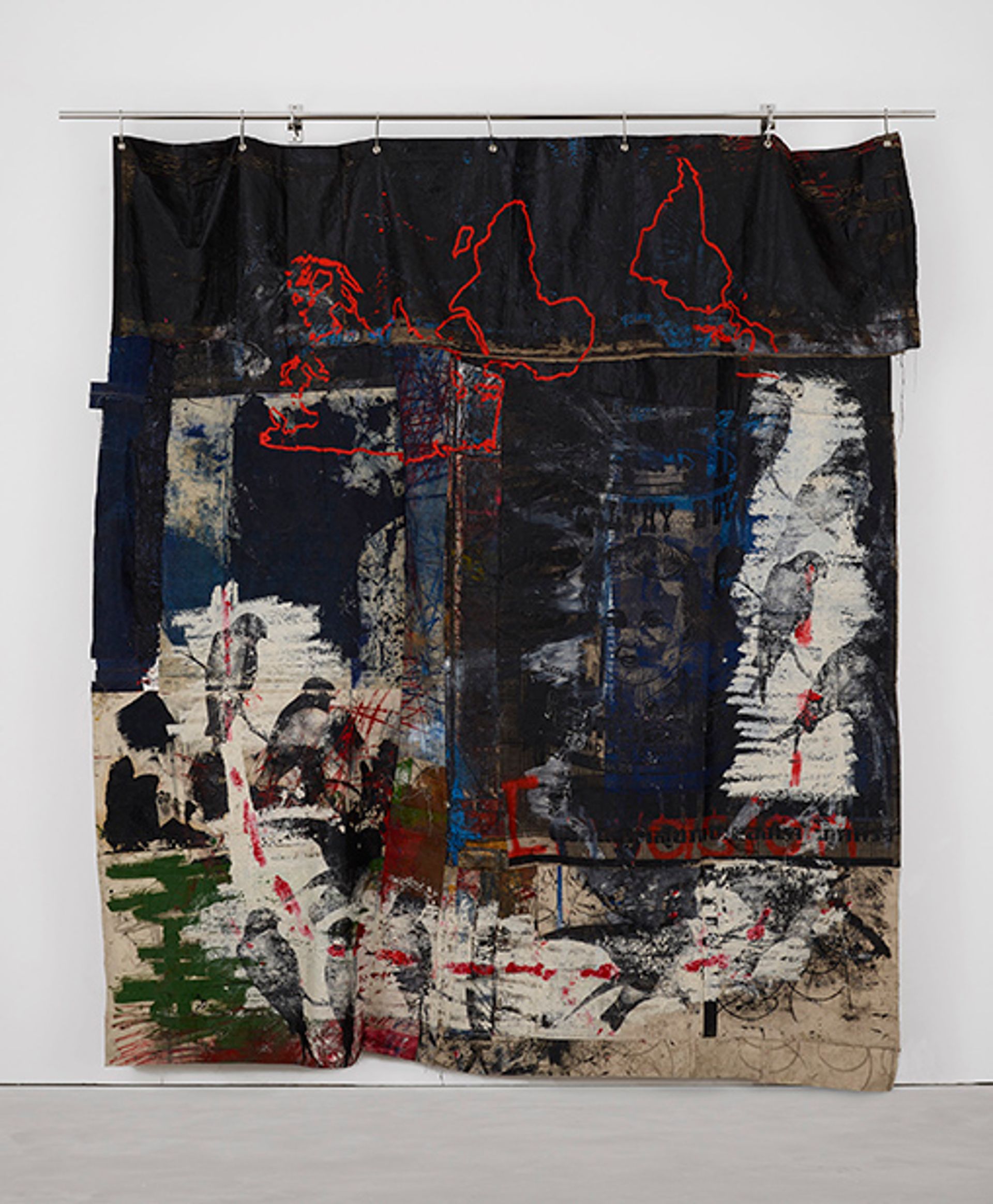 Case in point is the other work in the show that also has the title of Violent Amnesia. A dark intensely layered painting begun in 2014 and finished just last year, it hangs like a flag and depicts a partial world turned upside-down, showing Africa and Asia, but edits out Europe or North America. This is accompanied by images of birds both emerging from and being subsumed within the surface, referencing freedom of movement and its curtailment.