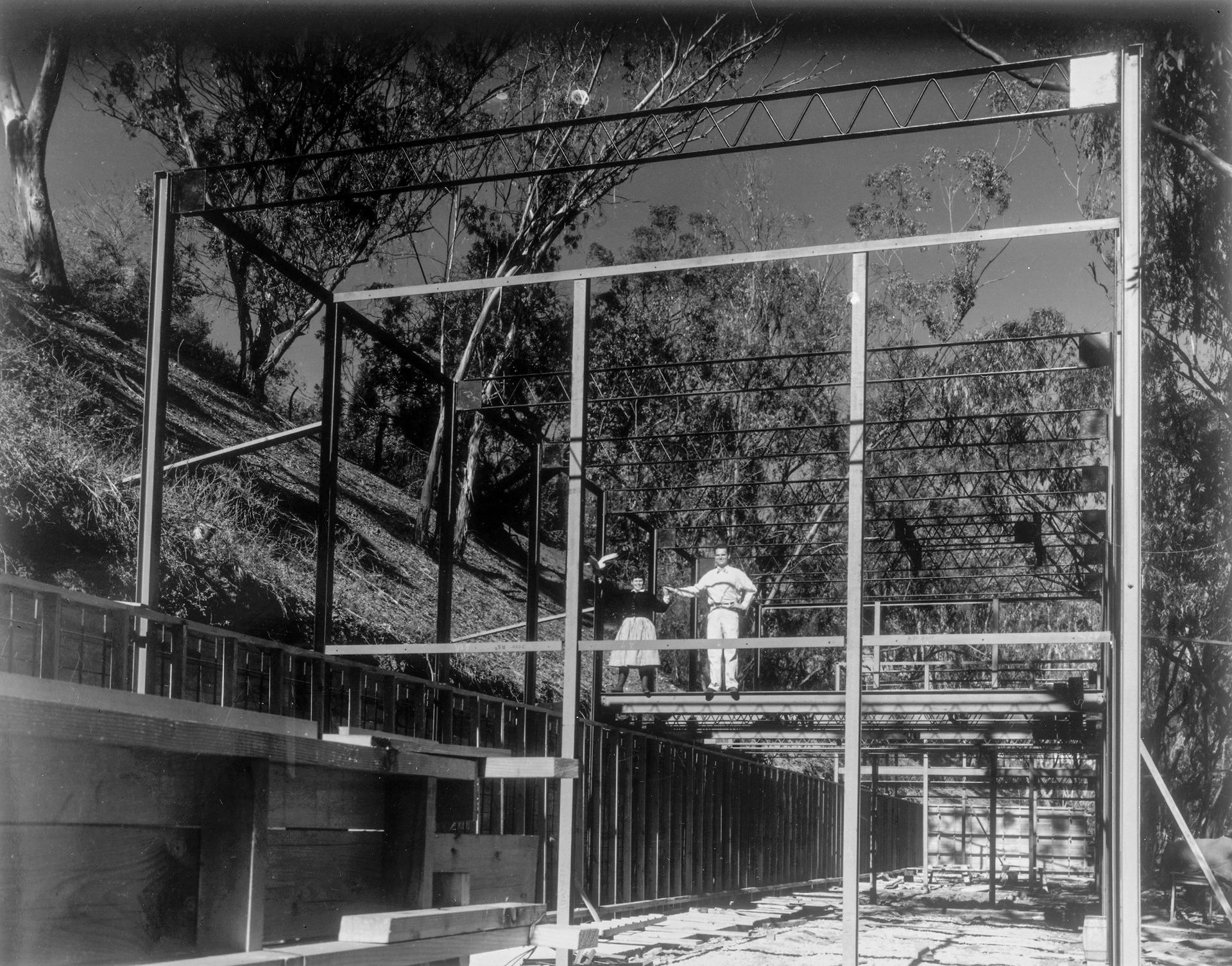 Ray and Charles Eames standing on the steel frame of their house in 1949 © Eames Office