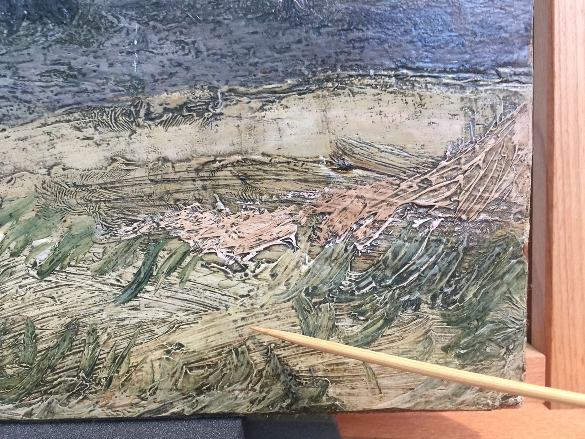 Following the recovery of View of the Sea at Scheveningen, the lost area in the lower-left corner (around 7cm high and 2cm wide) was reconstructed using a novel approach. Conservators took a scan of the neighbouring areas of surviving thick paint and, using pre-theft raking light images—in which a painting is illuminated from the side to reveal its surface—created a 3D-printed mould from which a replacement section was made. This was then attached to the picture, with its surface retouched to match the lost original paint.