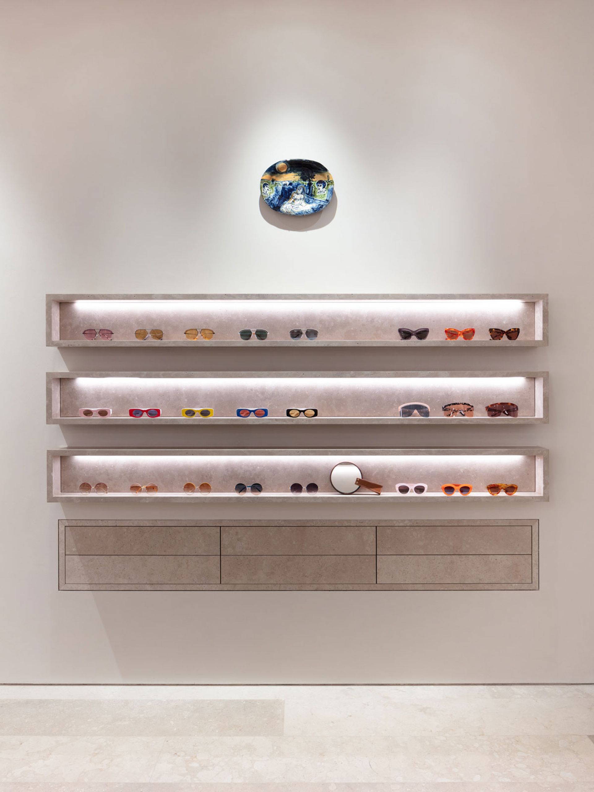Grayson Perry's plate hangs above shelves of sunglasses © Loewe