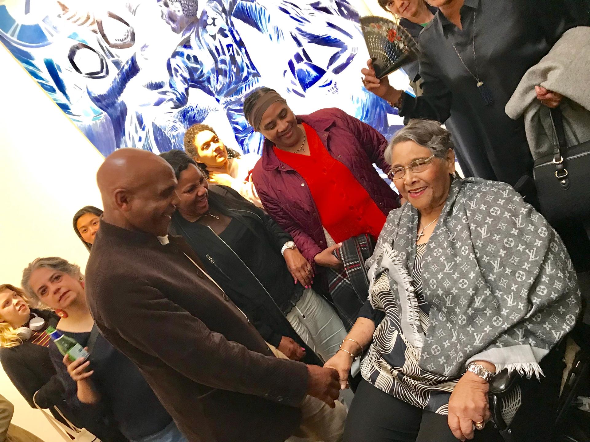 Wednesday night, just as Forrester was standing in front of the painting and recounting his mother’s prowess as a seamstress to Melanie Keen, the family matriarch arrived in person to much applause from the crowd, which included Friedman artists Yinka Shonibare and Lisa Brice as well as Forrester’s old friend, the legendary dub poet Linton Kwesi Johnson. Later on the music in Forrester’s club paintings was brought emphatically to the fore when yet another major figure from the period, the film director, DJ and musician Don Letts—the man instrumental in fusing punk with reggae—did a stint on the decks at the after party. (Although sadly the London art crowd was rather more sedate in its moves than the revellers in Forrester’s paintings)
