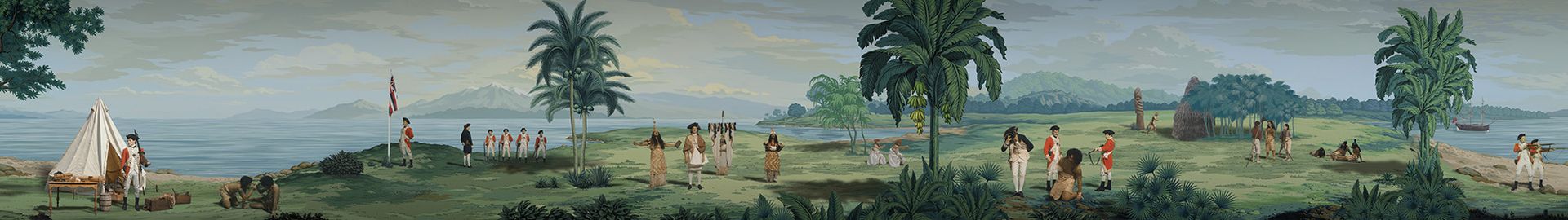 “It’s really captivating—the sheer scale and scope of the work is mesmerising,” says Claudia Schmuckli, the curator in charge of contemporary art and programming at FAMSF. The 80ft wide, 13 ft tall “digital scroll” with a soundtrack—a full 64 minutes—re-interprets an 1804 French wallpaper by Joseph Dufour, Les Sauvages de la Mer Pacifique (officially translated in press materials as “Natives of the Pacific Ocean”, but literally, “savages”). Based on voyages of Europeans like Captain James Cook, the wallpaper cast native Pacific people as “noble savages”, dressed in Roman-style clothing and with lighter skin tones.