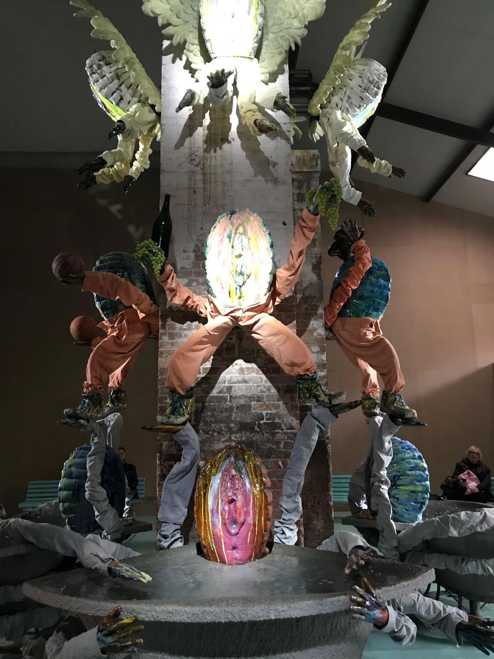 Water spurts out of enormous ceramic vaginas as seaweed plucked fresh from the lagoon hangs off the walls: Kris Lemsalu’s Estonian pavilion installation on Giudecca is not subtle, but it is evocative. A boat filled with multi-handed characters greets you first, as if shipwrecked from the grand canal, leading to an enormous fountain covered in oval shapes that leak and dribble into big grey bathtubs. It works so well because it is not just playful, sexual and pretty, but because it feels like it actually reacts to its environment, like it belongs in Venice; not like it was just plonked here by some curator.