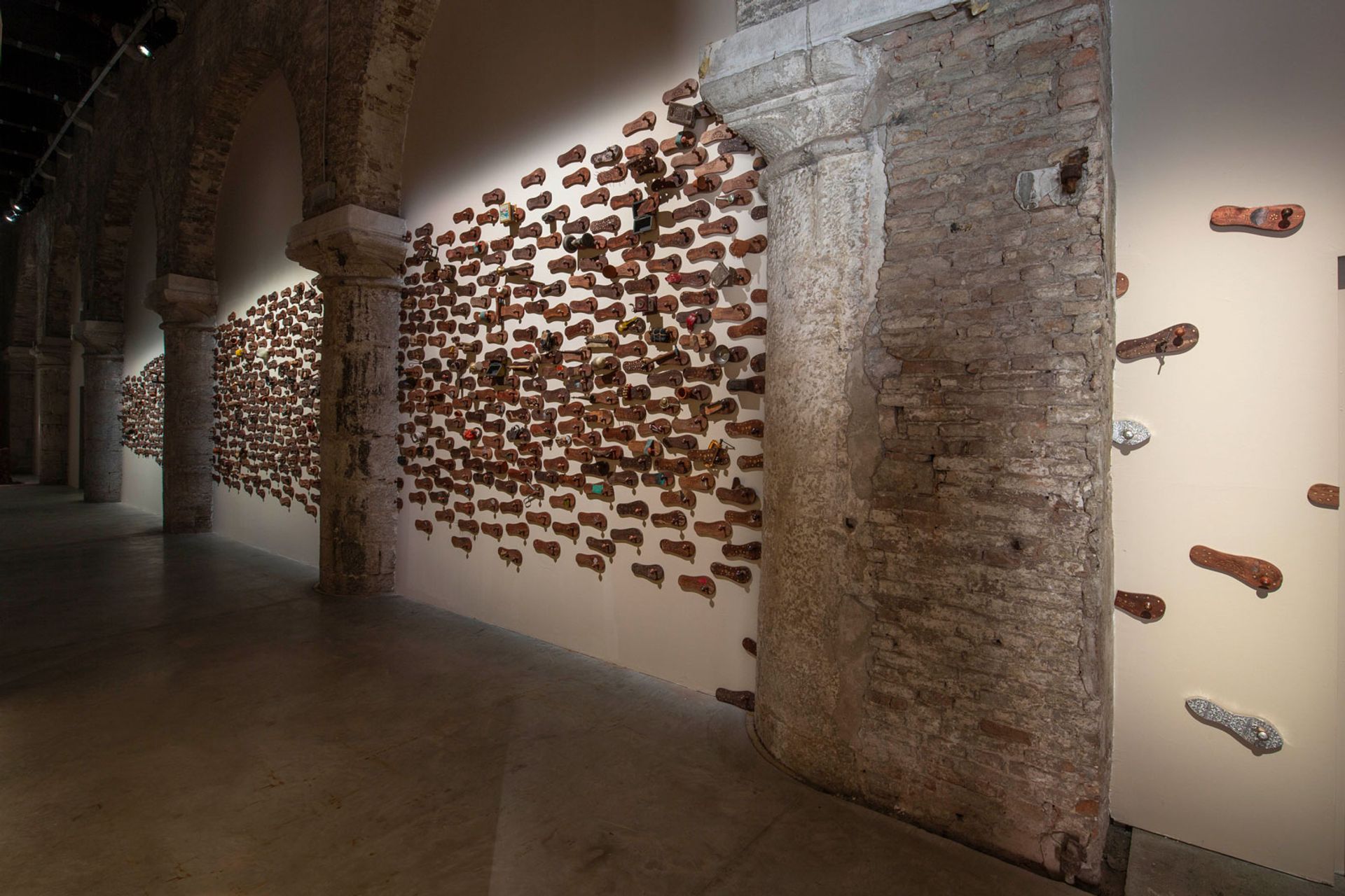 Mahatma Gandhi, perhaps the most famous Indian of all time, forms the central theme to the group exhibition at the India Pavilion. In Broken Branches (2002), Atul Dodiya has recreated the old wooden cabinets found in the Gandhi museum in Porbandar, filling them with prosthetics, books, tools and weaving in personal items, while GR Iranna has covered one of the walls with hundreds of wooden padukas for his work Naavu (We Together) (2012), which refers to Gandhi’s choice of wood slippers—he rejected leather—and the power of collective marching. Jitish Kallat is showing Covering Letter (2012), a screen of mist—which seems to be in vogue at this year’s Biennial—onto which is projected a letter that Gandhi sent to Adolf Hitler in July 1939 urging him to resist “reducing humanity to a savage state”. The theme marks the 150th anniversary of the birth of the Indian independence leader—and sometime controversial character—and also sees a return for the Indian Pavilion after an eight-year hiatus.
