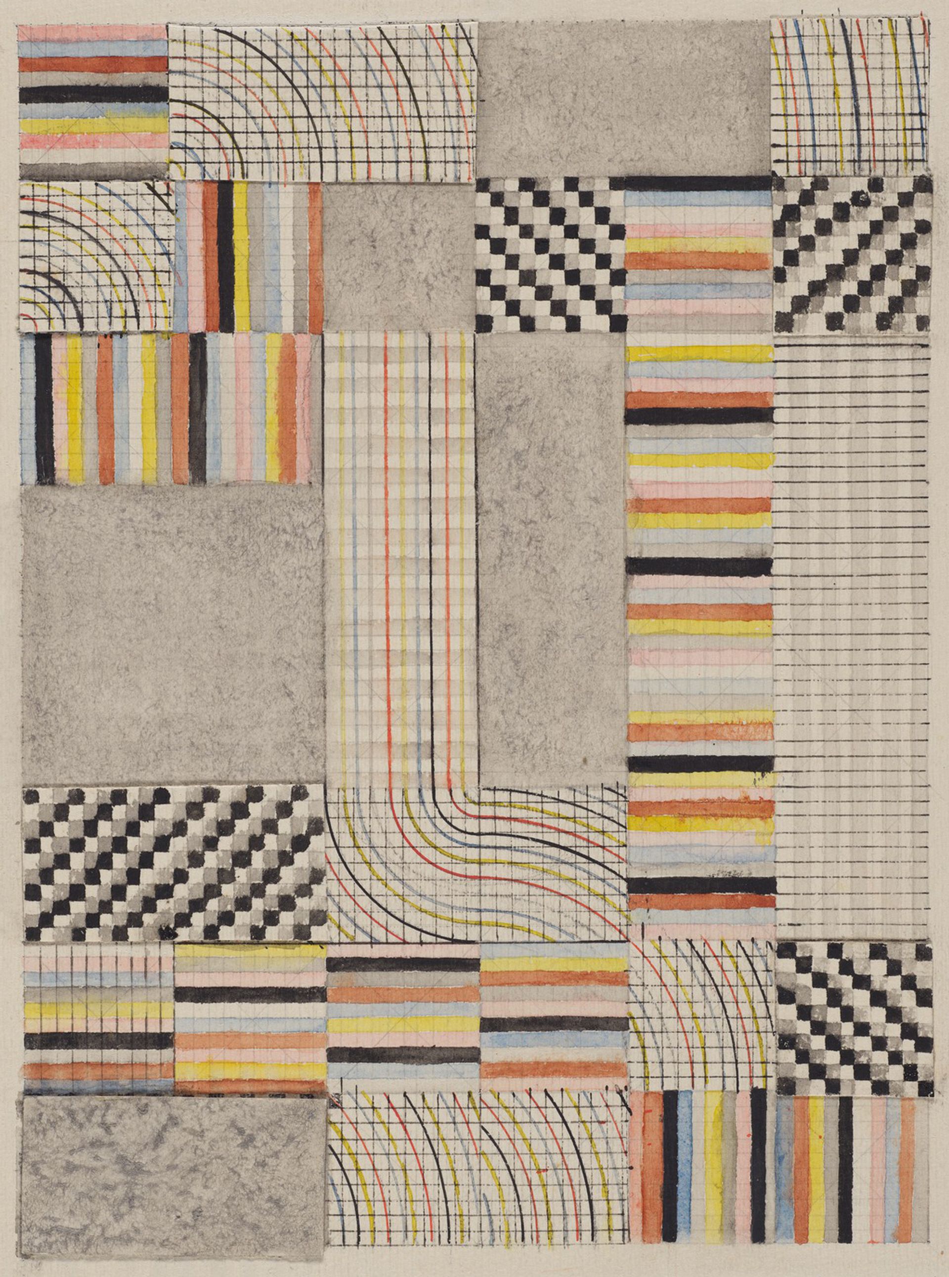 Harvard was not the only place steeped in Bauhaus, though, and the fascinating H. Sophie Newcomb College in New Orleans figures in this show too. A pigment tone collage used in classes there in the 1940s is a whimsical though effective teaching tool.