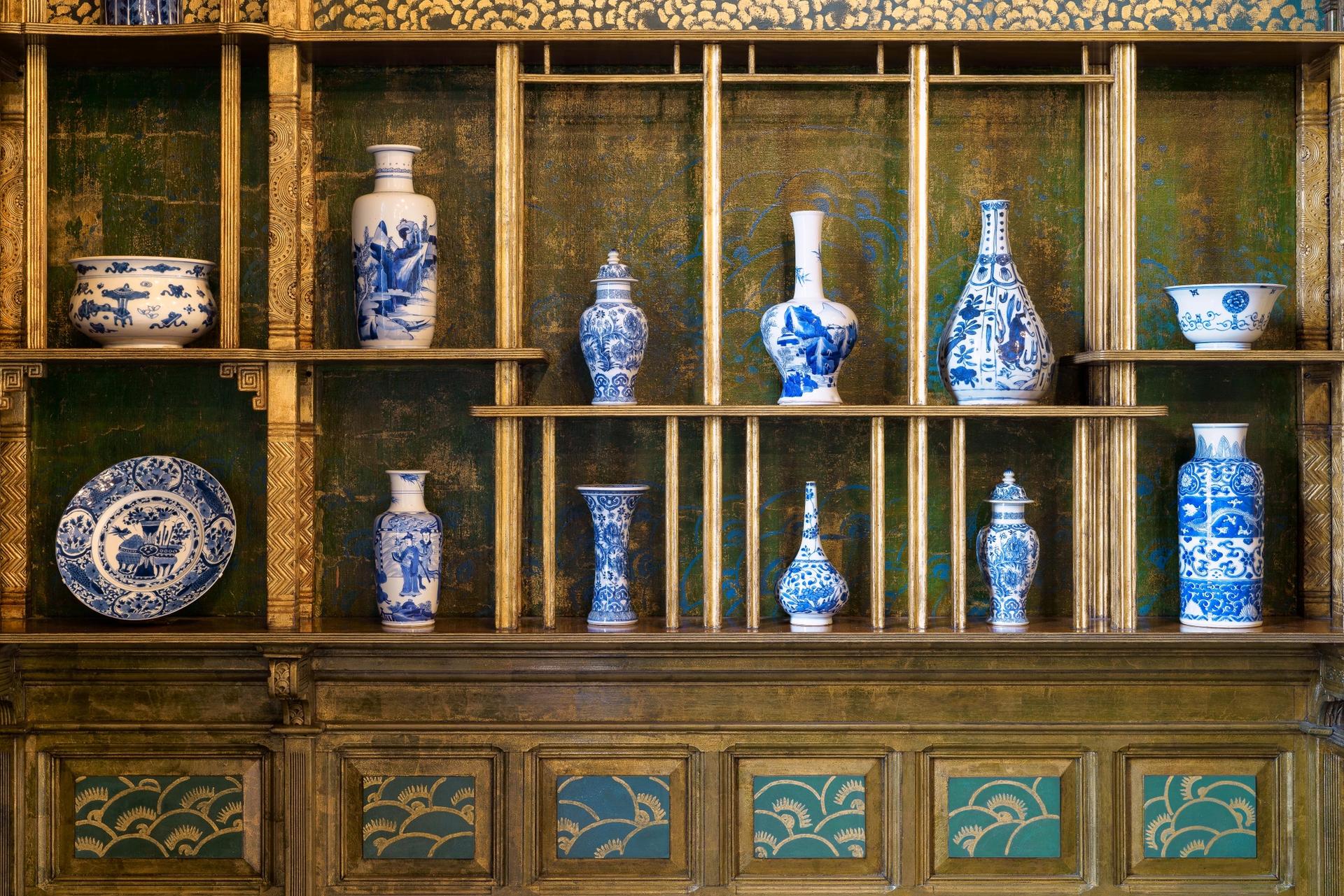 The new installation, based on an archival study of photos of the Peacock Room taken in 1892 in Leyland’s house, brings back the colour harmonies in Whistler’s original conception of the space. Two walls showcase 82 blue-and-white Kangxi-era pieces from the Freer’s holdings. Lacking enough period ceramics to fill the room, the museum commissioned 95 new Kangxi-style blue-and-white porcelains from Jingdezhen, China, the traditional centre of the craft, for the other two walls.